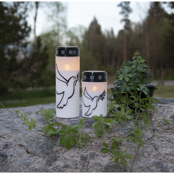 Gravljus med tryckt mönster i form av en flygande Duva. Höjd 12cm. Extra lång livslängd; 2500 timmar och med inbyggd timer.
