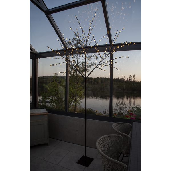 Utomhusdekoration i form av ett träd, hela 250cm högt. Svart stam och grenar med vita små bollar över varje ljuspunkt. 240 varmvita LED som ger ett stämningsfullt sken och passar lika bra till jul som året runt. Monteringsanvisning och tältpinnar medföljer för enkel ihop- och fastsättning. Timerfunktion, 6 timmar på och 18 timmar av, i transformatorn.