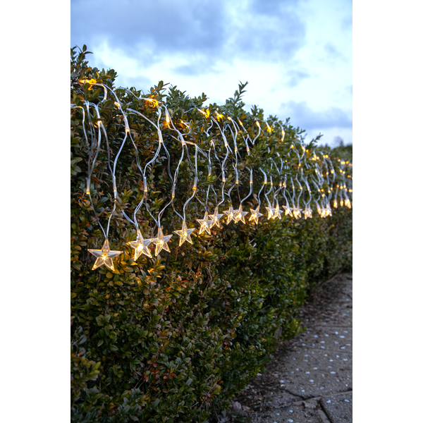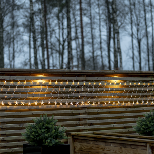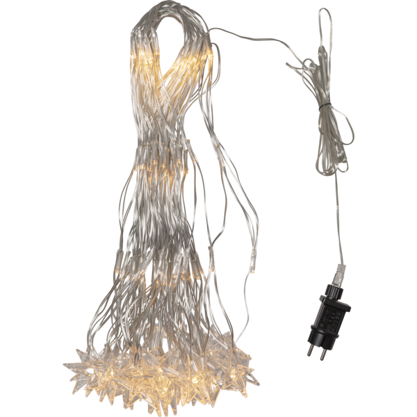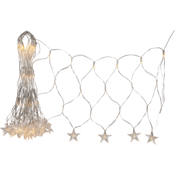Ljusnät i transparent kabel, storlek 4,8x0,4m. I nederkant hänger 40 st stjärnor, totalt har nätet 160 varmvita LED som ger ett vackert sken. IP44-klassad transformator med 5 meter startkabel. Lys upp tex balkongen, husväggen eller hustaket med detta dekorativa nät.