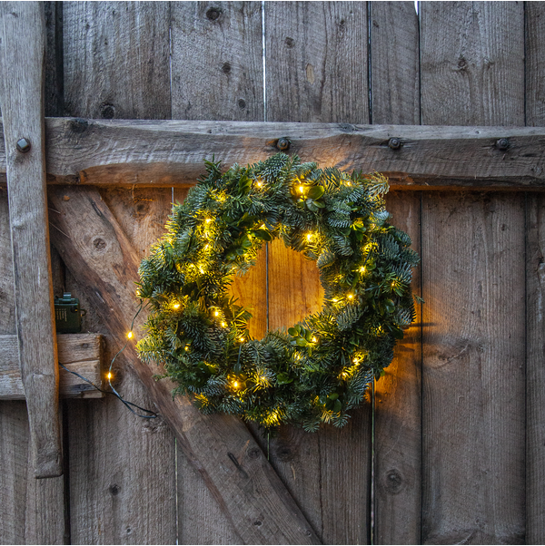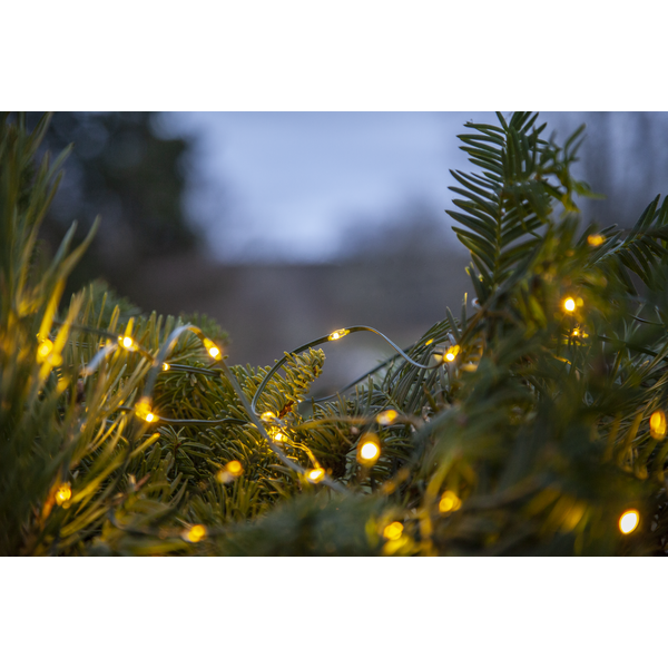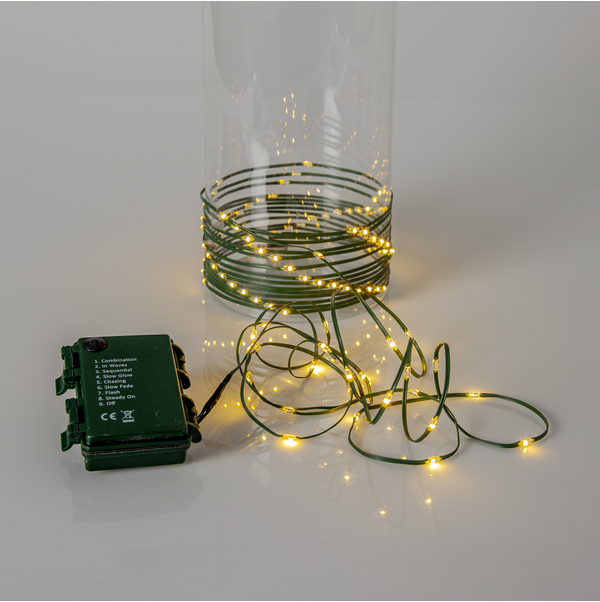 Tunn platt batteridriven slinga med små ljuspunkter för utomhusbruk, perfekt och enkel att använda i träd, buskar, kransar, trappräcken mm. Grön kabel med 96 varmvita LED, 7,5cm mellan varje lampa ger en slinga på ca 7m. Batteribox med timerfunktion och 8 olika blinksekvenser varav en är med fast sken.