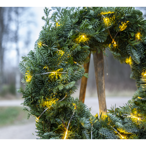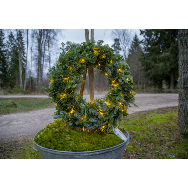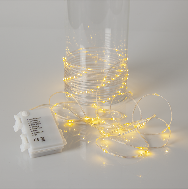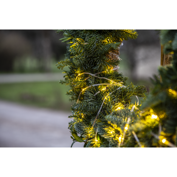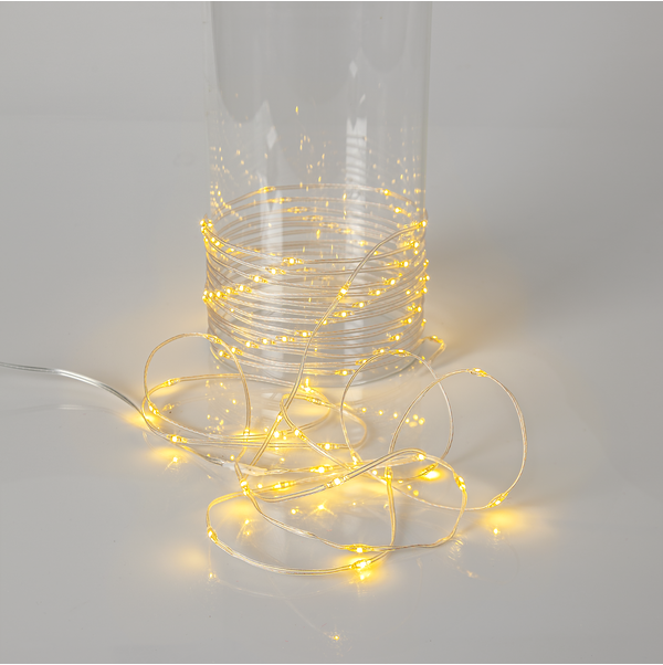 Tunn platt batteridriven slinga med små ljuspunkter för utomhusbruk, perfekt och enkel att använda i träd, buskar, kransar, trappräcken mm. Transparent kabel med 96 varmvita LED, 7,5cm mellan varje lampa ger en slinga på ca 7m. Batteribox med timerfunktion och 8 olika blinksekvenser varav en är med fast sken.