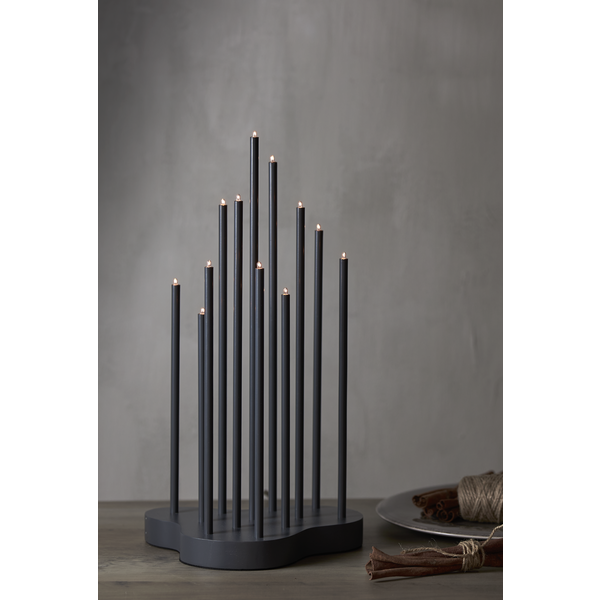 Stilren ljusstake med kraftig träbas, ljuspipor av tunna metallrör. 12st ljuskällor, E5 lampor. Hela ljusstaken i grafit färg. Textilkabel i vitt/grå. Ger ett härligt stämmnigsfullt ljus hela året runt.