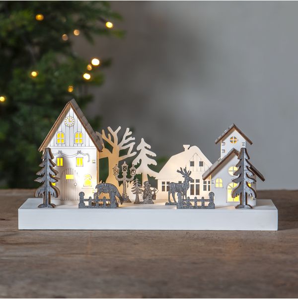 Fin laser cut ljusstake med julmotiv för inomhusbruk. Ljusstaken har 4 stycken led ljus och många fina detaljer. Placera i fönster eller på en skänk för en härlig julkänsla.
