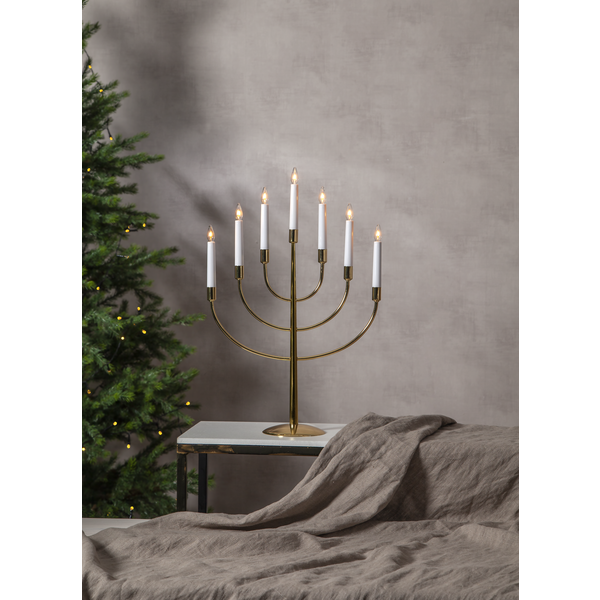 Vår eleganta metalljusstake Titus i mässingsfärg med senaste ljuskällan. 7 ljuskällor, soft glow. Sprider ett härligt ljus och skapar julstämning.