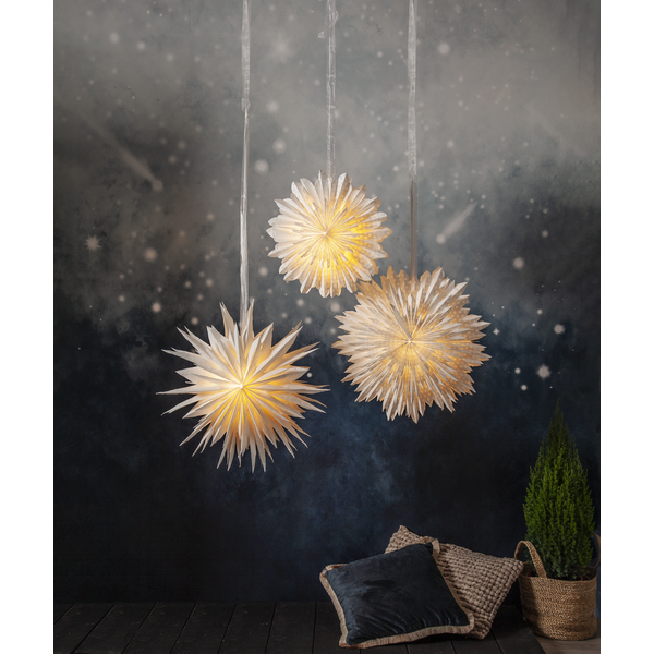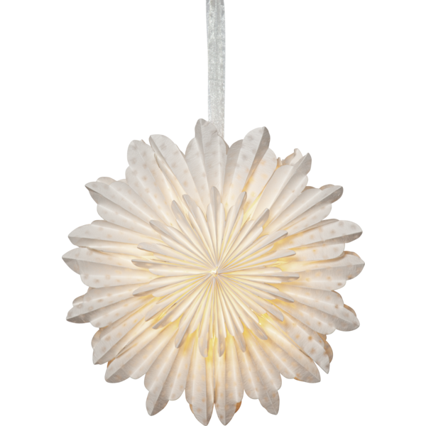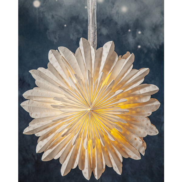Magisk pappersstjärna som är tillverkad av två lager veckat papper. Pappret är tillverkat av återvunnen bomullsspill från t-shirt tillverkning. Strukturen i pappret blir därför mjukt och i själva pappret ser man vattenstämplade prickar. Konturen har mjuka rundade flikar. Ett elegant band ingår för att lättare kunna hänga upp stjärnan. Stjärnan sprider stämning och ger hemmet den där speciella advent och julkänslan. Kan hängas både i förnster och mot en vägg.