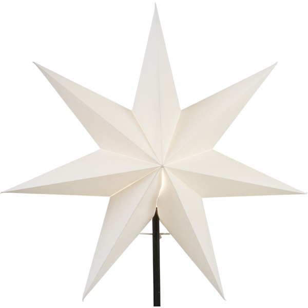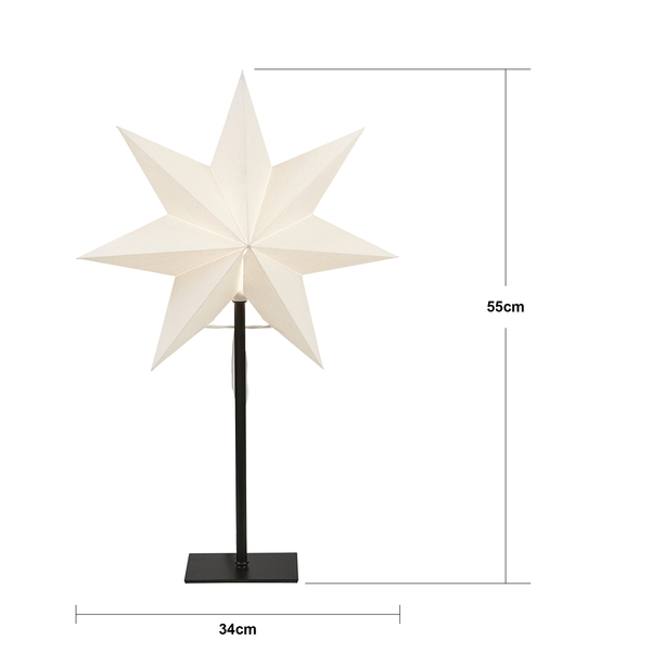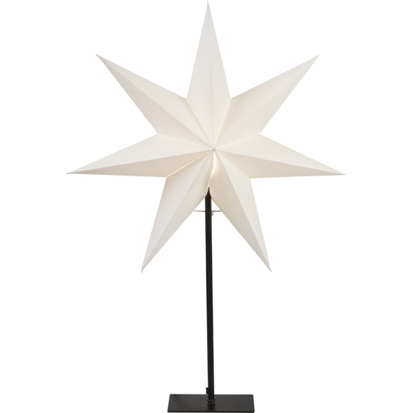 Vit stjärna på fot med svart textilkabel. Elegant stjärna att dekorera med i hemmet. Stjärnan har plats för en ljuskälla. Höjden är 80cm.