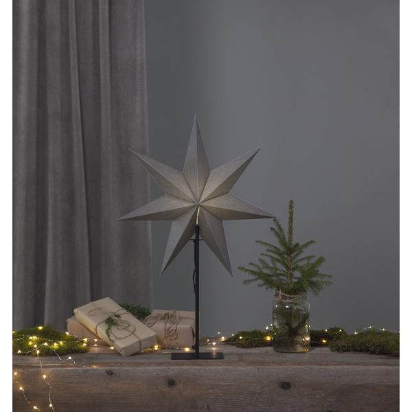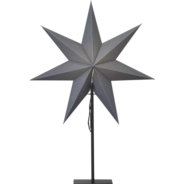 Grå stjärna på fot med svart textilkabel. Elegant stjärna att dekorera med i hemmet. Stjärnan har plats för en ljuskälla. Höjden är 80cm.