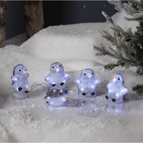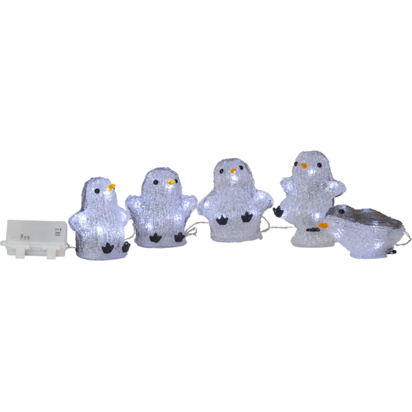 Dekorationsslinga med figur i form av pingviner. Går bra att använda både inom- och utomhus. Härlig dekoration att ha i trädgården, eller varför inte splacera dom vid julgranen eller ytterdörren. Pingvinerna har 8 små LED-ljuskällor per fågel, dom lyser fint i mörkret. Drivs av batterier och har timer funktion.