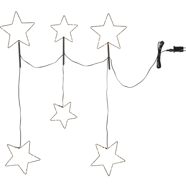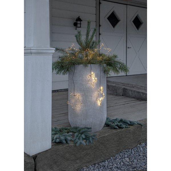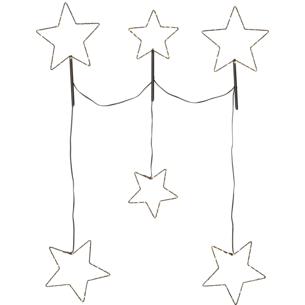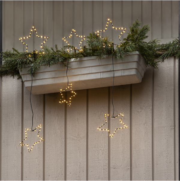 Set om 6 st stjärnor, 4 st 20cm och 2 st 15cm. Svart metallstomme med tunn svart metallslinga virad runt. Totalt 200 varmvita ljuspunkter. IP44-klassad transformator med 5m startkabel. En snygg dekoration som passar perfekt till blomlådan eller en större kruka.