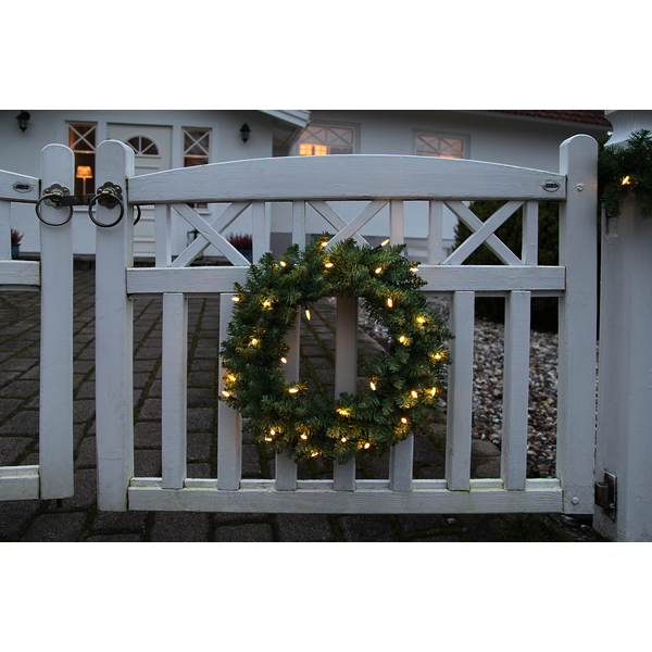 Grön krans med 30 varmvita LED-lampor. Kransen ger ett fint och inbjudande sken i mörkret. Dekorera med kransen inomhus eller utomhus exempelvis mot en vägg eller på en dörr.