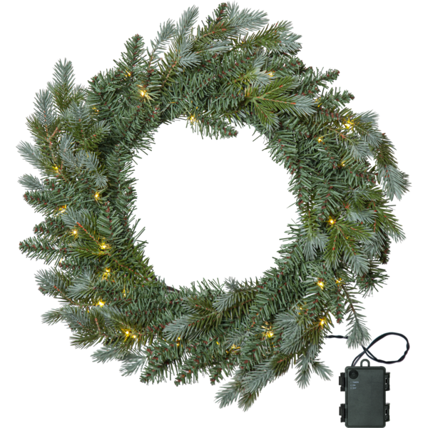 Kransen Greyland är ca 55 cm i diameter. Den är tillverkade av en mix av PE tips och PVC tips med ett vackert grå-grönt skimrande utseende. Med 40 små varmvita ljuspunkter lyser den upp vackert både inomhus och utomhus. Slingan kan både lysa konstant eller sättas med timer som lyser upp i 6 timmar och är släckt 18 timmar för att sedan tändas igen nästa dag. Den drivs av 3st AA batterier, de medföljer ej. I samma familj finns även granar, fler storlekar på kransar och en girlang.