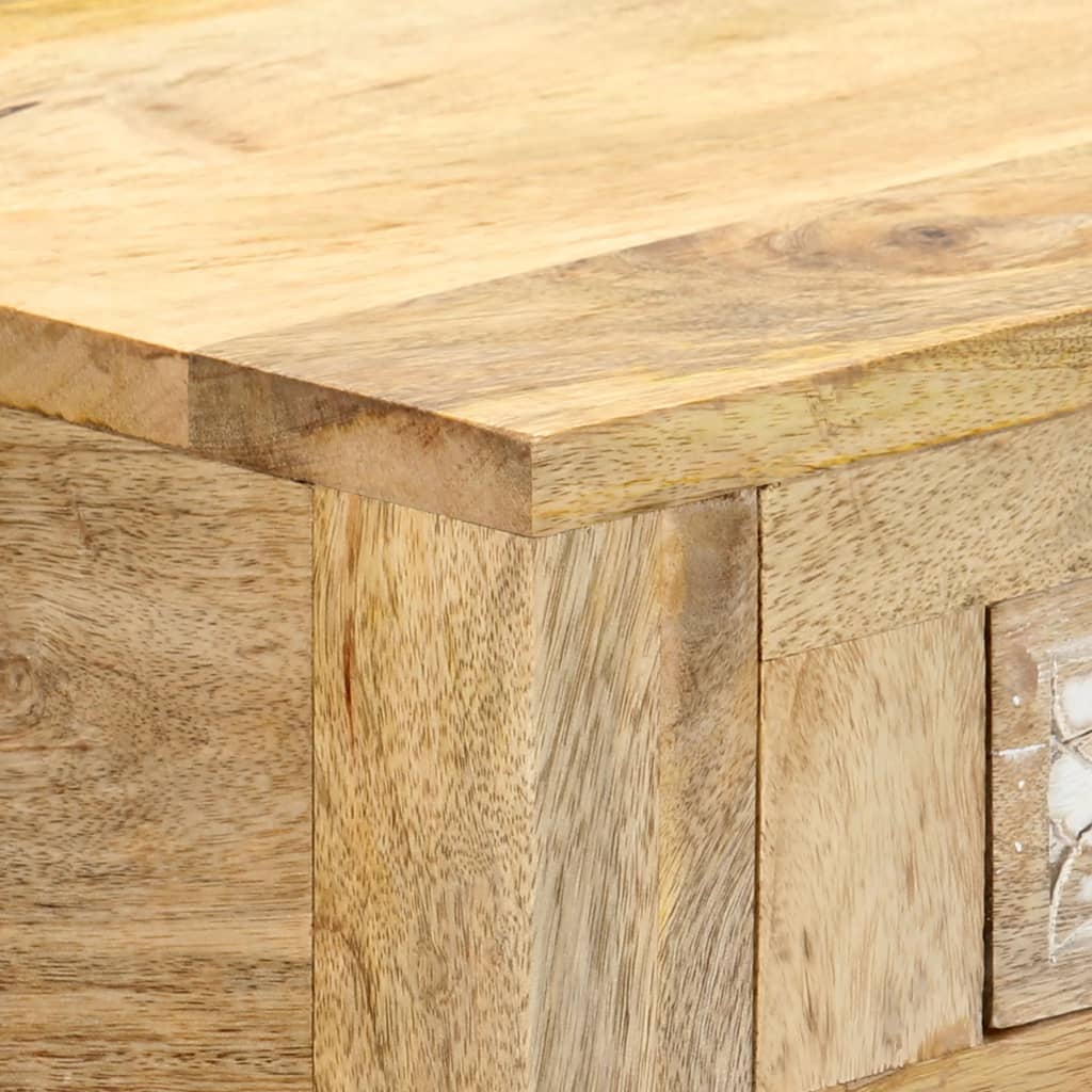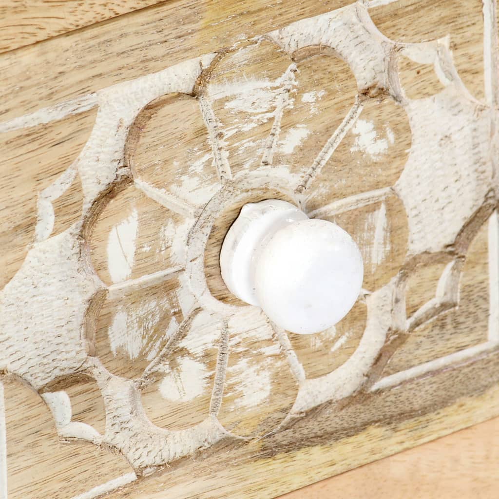 Detta avlastningsbord är multifunktionellt, vilket betyder att det även kan användas som ett sminkbord att ställa under sminkspegeln. Hifi-bänken är tillverkad av massivt mangoträ med en blekt finish vilket gör det ytterst stabilt och hållbart. Det skickliga hantverket och mangoträets vackra ådringar gör varje möbel unik och något olik de andra. Dess dekorativa snidade mönster och metallhandtag bidrar till sidobordets vackra utseende.