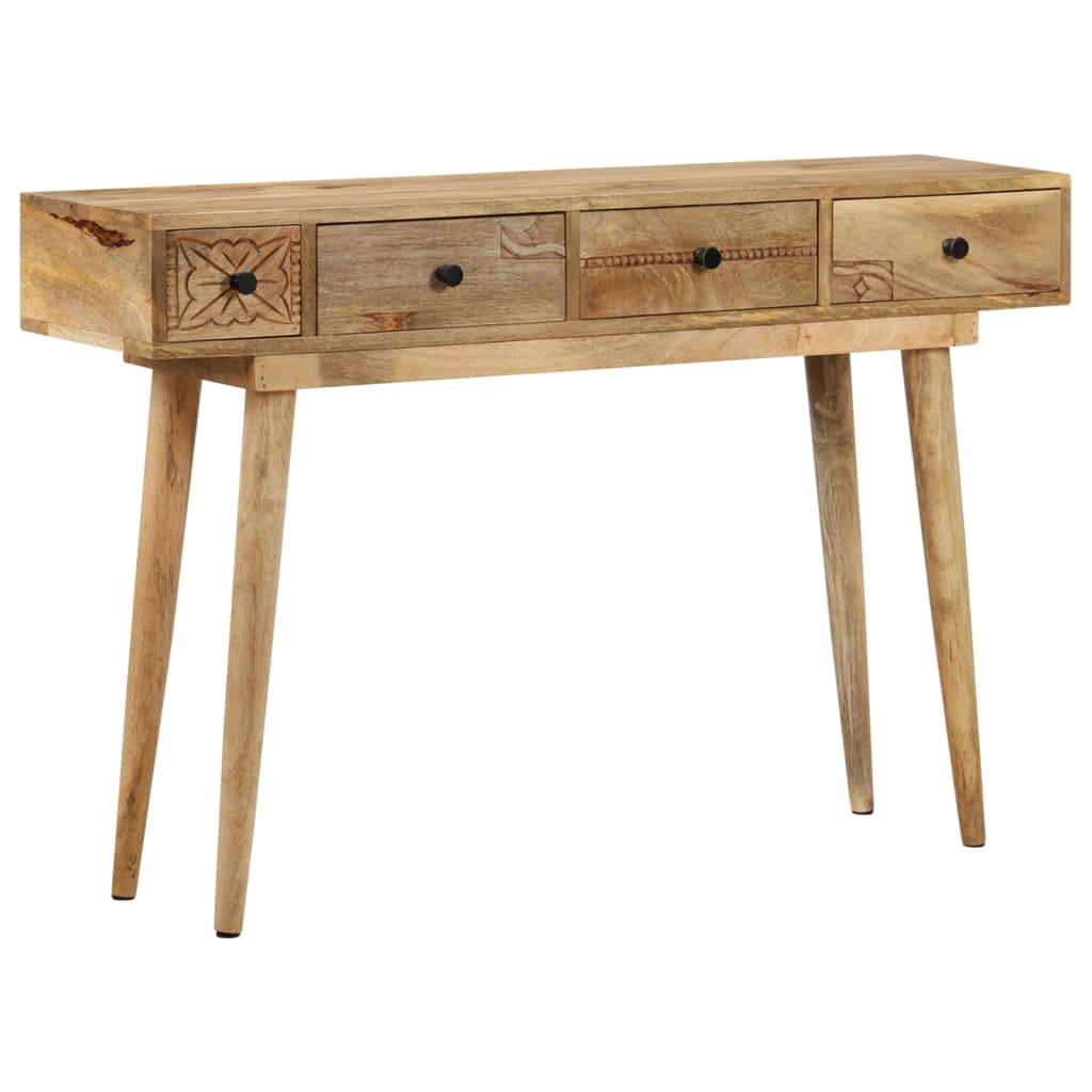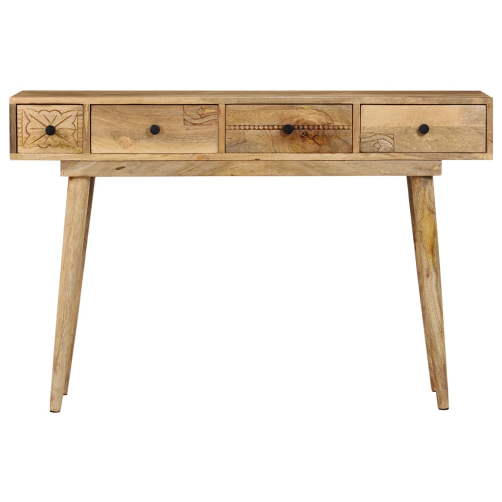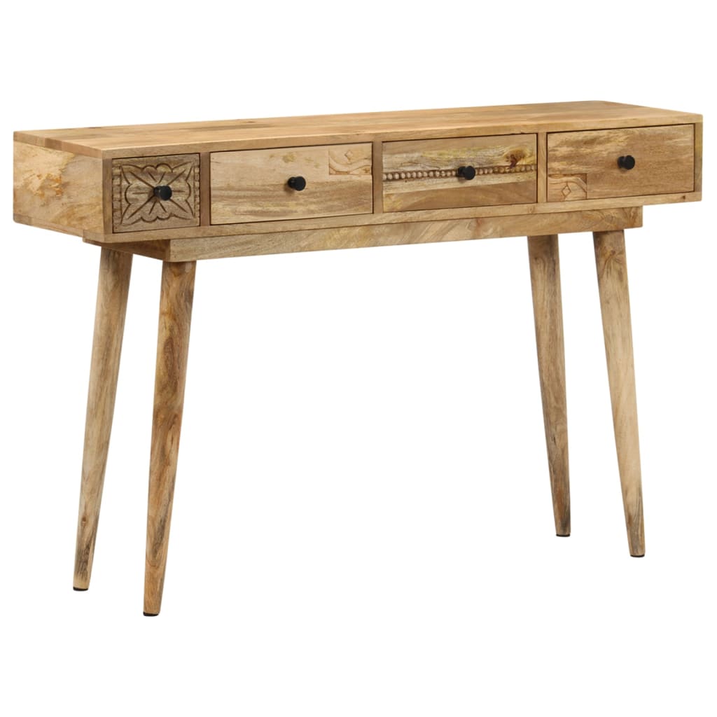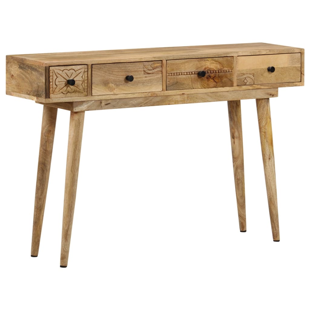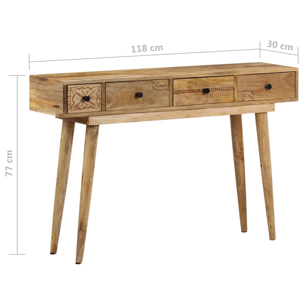 Det här hallbordet är tillverkat av massivt mangoträ, som är ett lövträ med täta fibrer. Massivt mangoträ har inte bara styrkan att bära vikten, utan klarar också slitage över tid. Den robusta bordsskivan kan visa dekorativa föremål, fotoramar eller till och med krukväxter, och du kan förvara småsaker som nycklar, anteckningsblock, pennor och andra prylar i dess fyra rymliga lådor. Träbenen bidrar också till dess robusthet. Den synliga kornstrukturen gör varje möbel unik och något annorlunda än de andra.