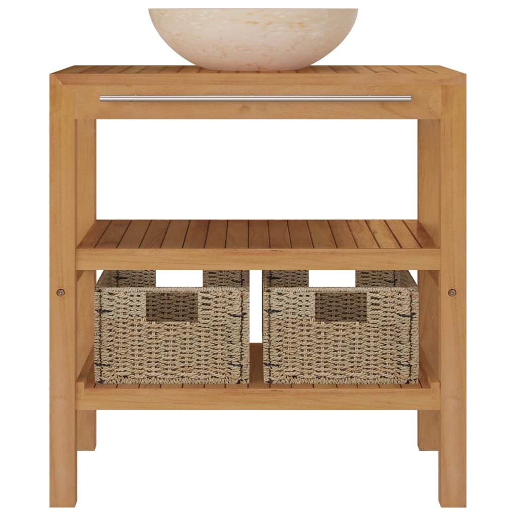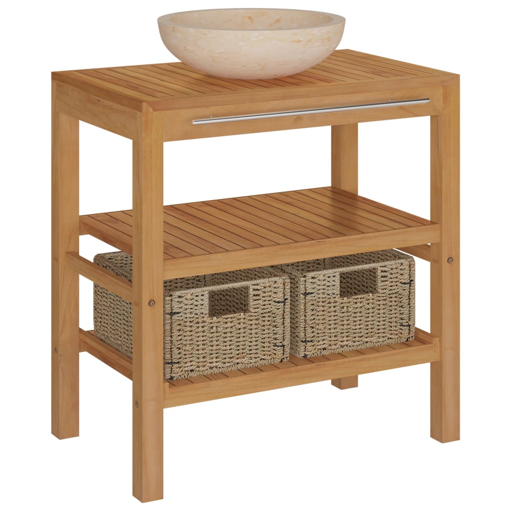 Underskåpet är tillverkat i massiv teak som är tillräckligt hållbart och stabilt att ställa ett handfat och andra badrumstillbehör på. Skåpet har en handduksstång för handdukar eller kläder. Det har fyra ben som säkerställer stabilitet och att det förblir torrt. Det imponerande handfatet är användarvänligt för vardagsbruk och blir en vacker prydnad. De 2 korgarna längst ner låter dig förvara saker och hålla badrummet i ordning. Handfatet är helt handgjort i vacker marmor och är extremt hållbart och elegant. Dessutom är handfatet enkelt att rengöra. Underskåpet passar perfekt under handfatet och skapar gott om förvaringsmöjligheter i badrummet.