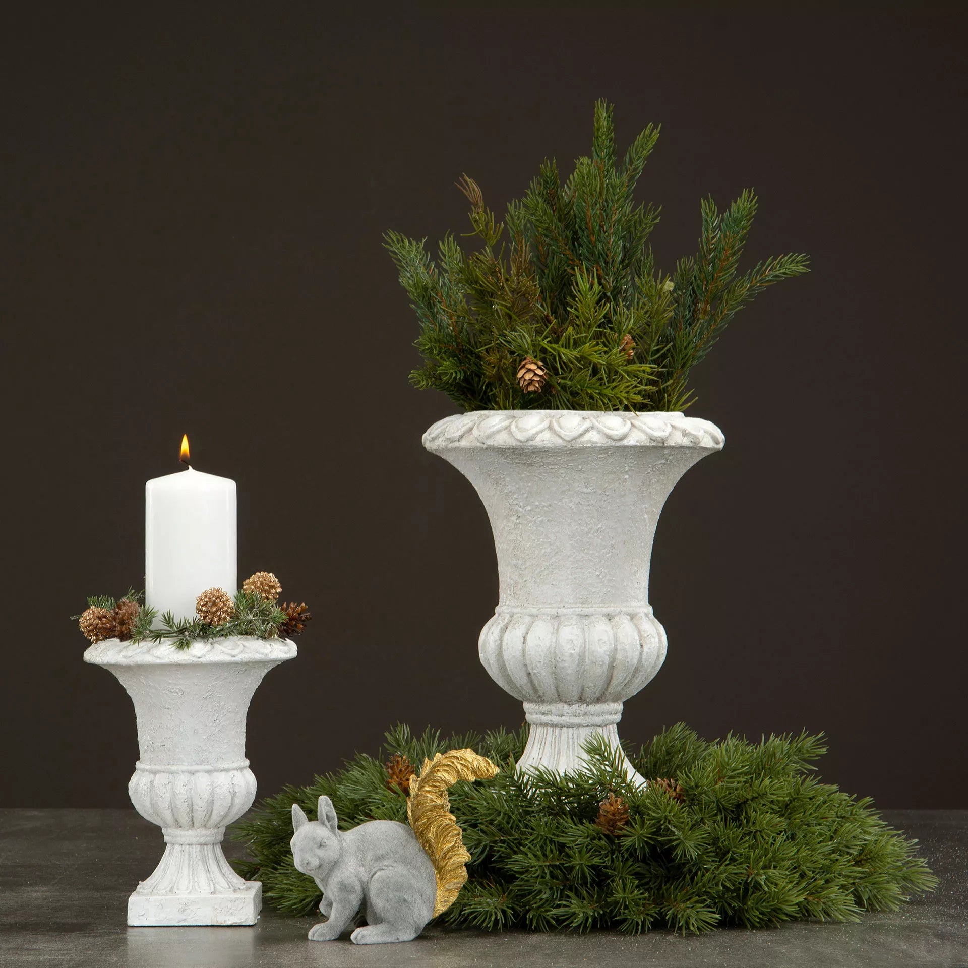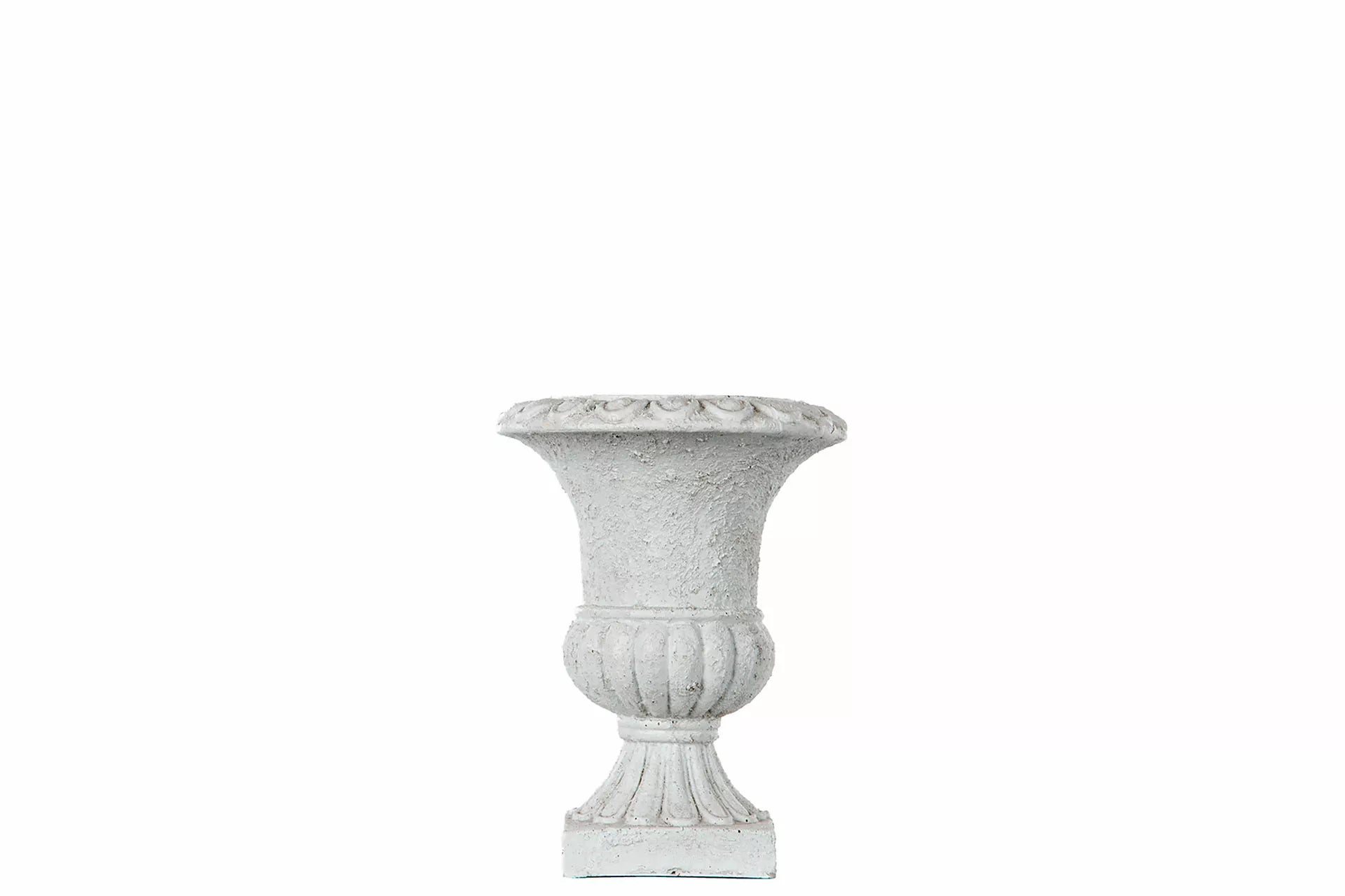 Romantisk och vacker kruka på fot. Krukan är tillverkad av polyresin och har en antikvit färg som ger den en rustik och vintage känsla. Den är 18 cm hög och har en diameter på 13 cm vilket gör den till en perfekt storlek för att visa upp dina favoritblommor eller växter. Krukan har många fina detaljer som ger den en unik och personlig touch. Den är perfekt för att skapa en mysig och varm atmosfär i ditt hem.