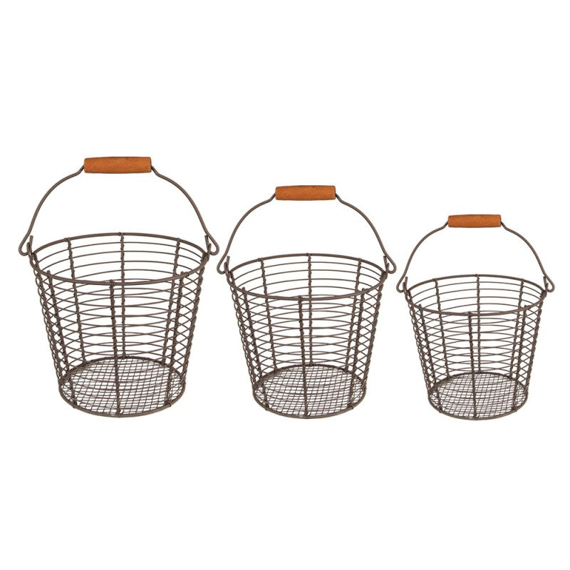 Fina metall korgar i ett set om 3 storlekar med trähandtag
