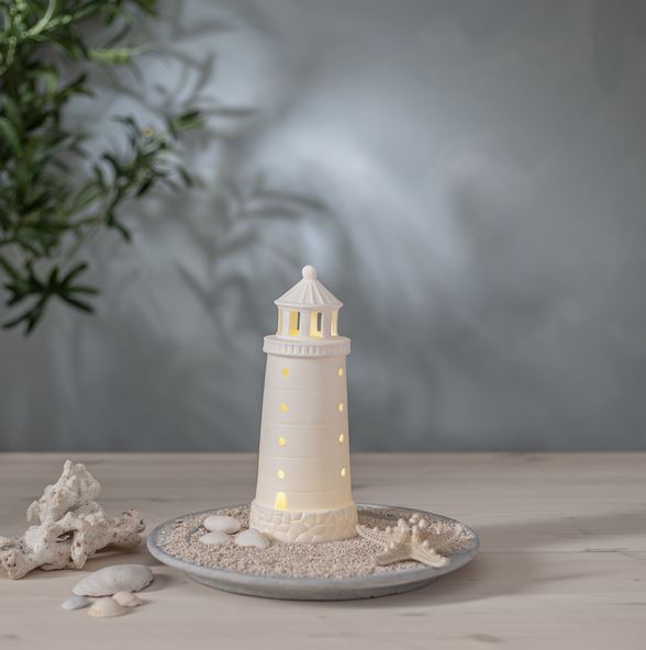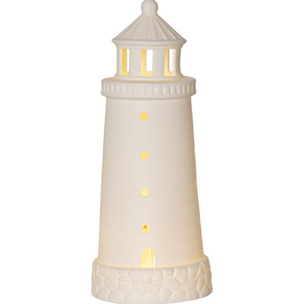 Batteridriven inomhusdekoration i form av en fyr. Tillverkad av matt vitt porslin. Lätt att kombinera med fler av dekorationerna i vårt Seaside tema. Lyser med ett behagligt varmvitt sken.