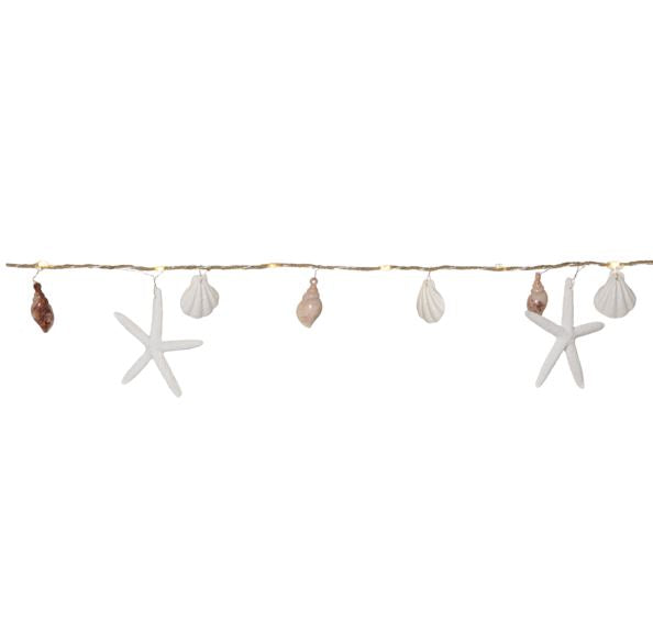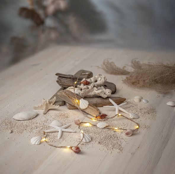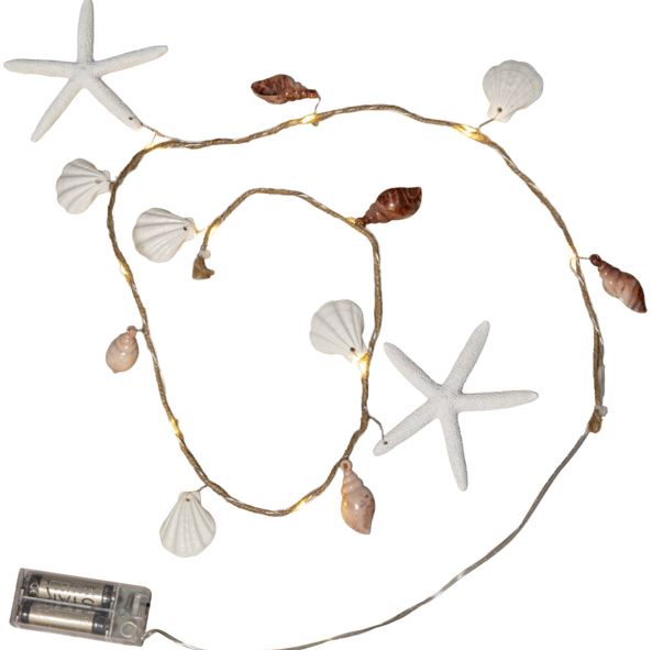 Batteridriven slinga för inomhusbruk med dekorationer i plastmaterial inspirerade av havet, bla snäckor och sjöstjärnor. 10 varmvita LED ger ett härligt sken. Juterep lindad runt den tunna metallkablen. Slingan har timerfunktion.