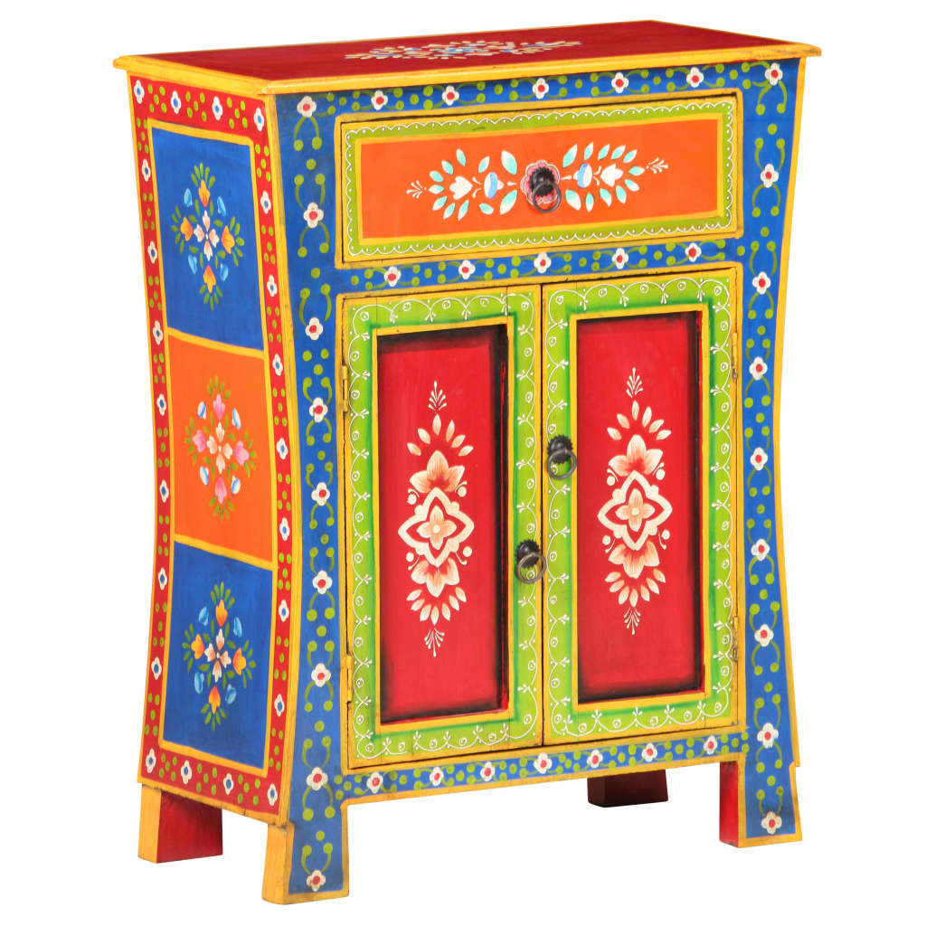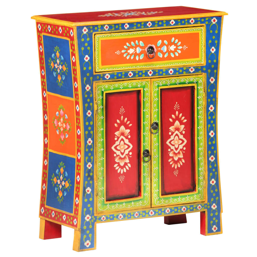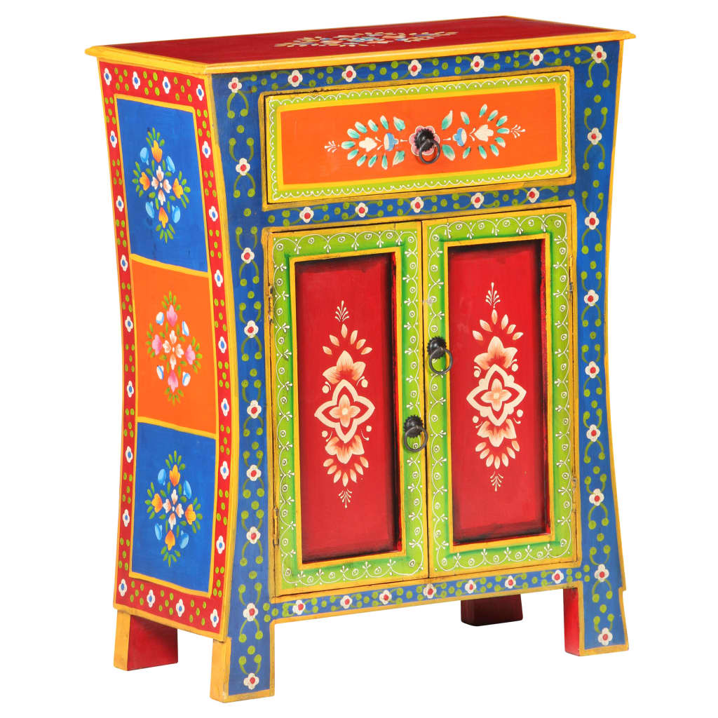 Denna skänk har handmålade dekorativa detaljer som gör det till en vacker dekoration i inredningen. Träskåpet har två dörrar och en låda med gott om utrymme för tidskrifter, böcker eller för att hålla alla möjliga småsaker organiserade och inom räckhåll. Du kan även ställa fotoramar eller prydnadssaker på den stadiga ovansidan. Förvaringsskänken är tillverkad i massivt mangoträ, ett tropiskt lövträ. Det är starkt nog att bära vikten och är även mycket slitstarkt. Dessutom gör det skickliga hantverket varje möbel något olik nästa.