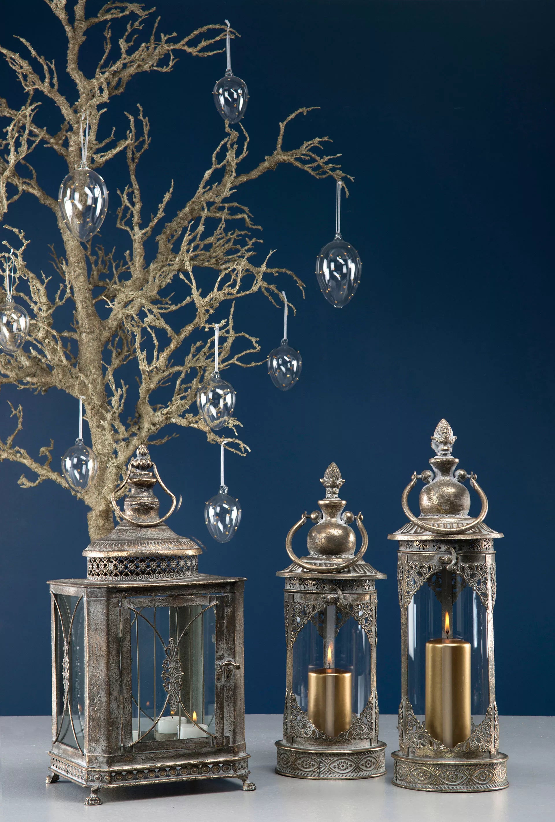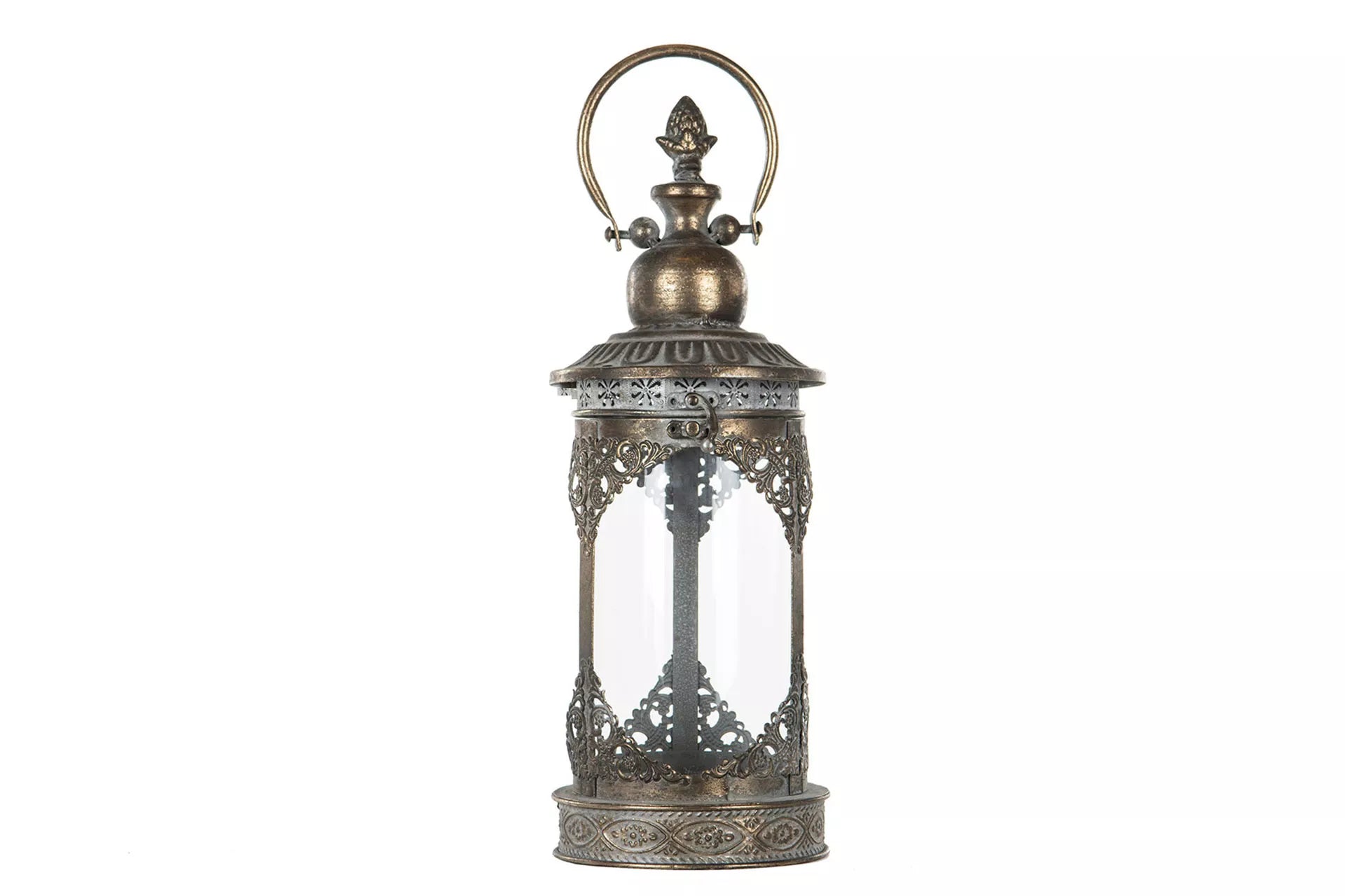 Lyktan har en höjd på 40 cm och bredd på 15 cm och är tillverkad av metall och glas. Dekorativt spetsmönster och en sliten guldbrun färg ger lyktan en gammaldags och romantisk känsla.