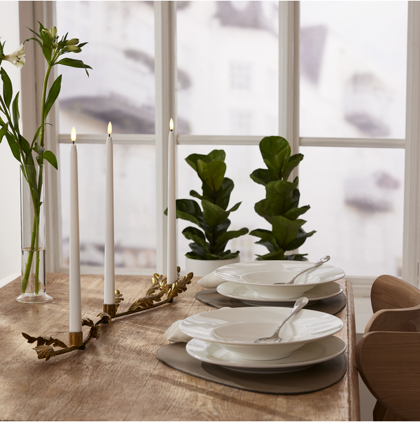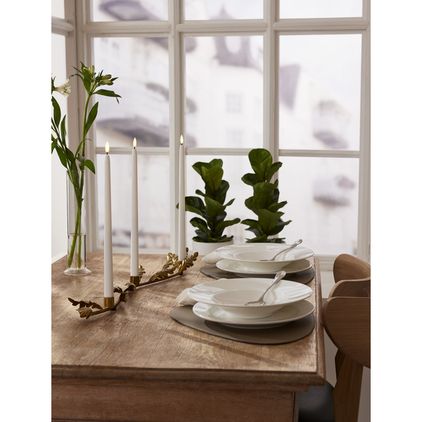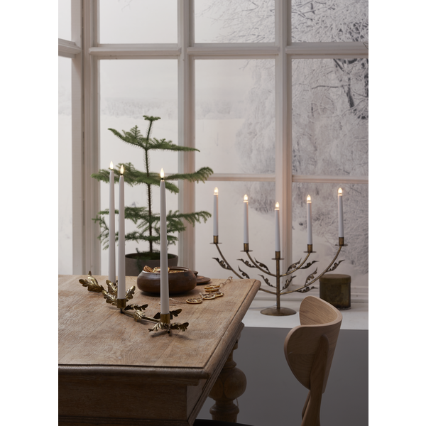 Elegant ljusstake i metall dekorerad med eklöv. Färgen antik mässing. En unik ljusstake som sprider fint sken i mörkret. En klassiker som lever vidare år till år. Används fördelaktigt med våra batteridrivna ljus.