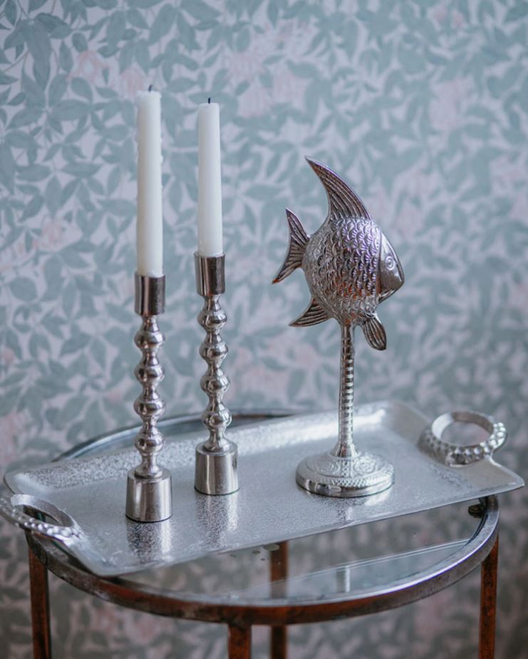 Elvira är en fin ljusstake som tillsammans med ett kronljus sprider ett vackert sken av levande ljus i rummet. Tillverkad i metall.