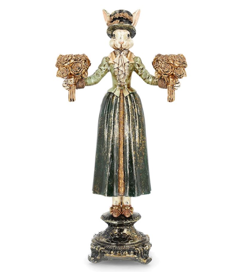 Kanin i klänning som håller två buketter i händerna där ljushållarna finns.