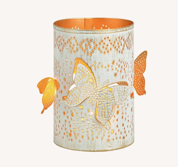 Ljusstake Värmeljushållare dekor fjäril av metall vit guld (B/H/D) 10x13x10cm