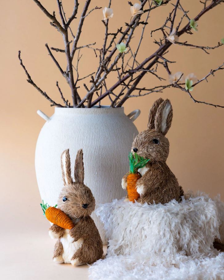 Dessa söta kaniner som håller varsin morot blir ett lekfullt tillskott i inredningen. Perfekt som påskdekoration. Tillverkade i naturmaterial.