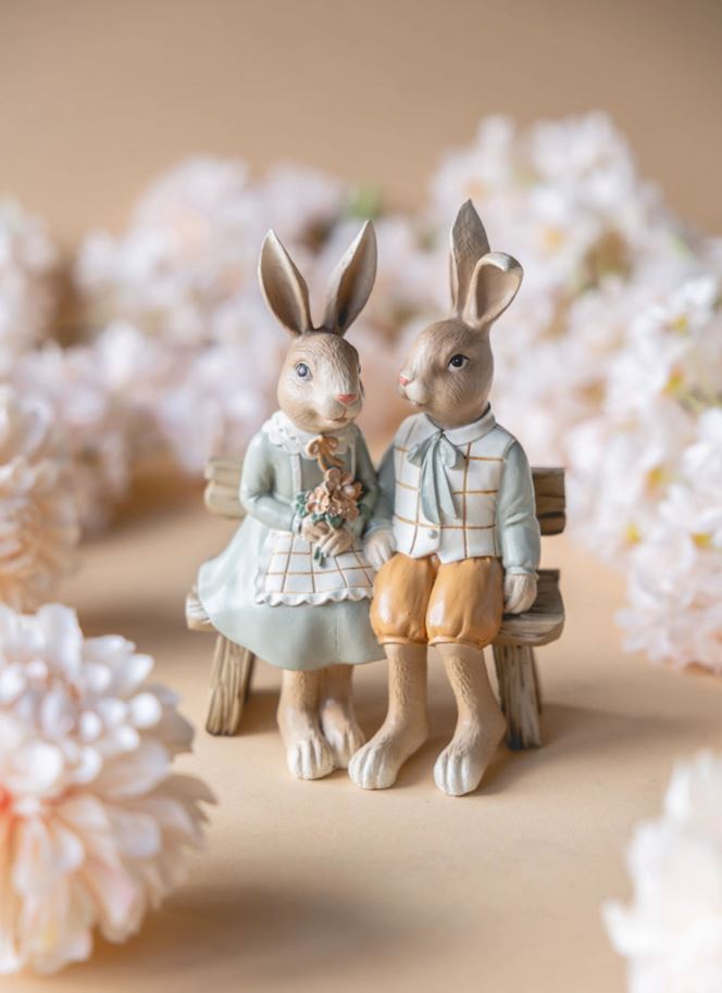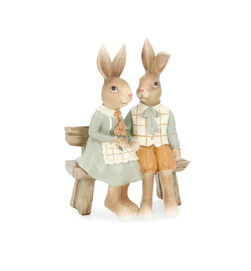Sött kaninpar som sitter på en bänk. Perfekt som dekoration i fönstret eller på soffbordet. Tillverkade i poly.