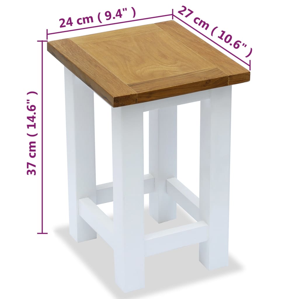 Borden har en bordsskiva i massiv ek som bidrar till deras stadighet och hållbarhet. Ekträet har vackra träådringar som ger möbeln en känsla av naturlig charm. Ramen är tillverkad i massiv furu med en vit finish som bidrar till småbordets moderna stil. Tack vare deras kompakta design tar dessa sidobord inte upp mycket plats men är väldigt praktiska. Deras stadiga bordsskivor är en perfekt plats att ställa mat eller drickor eller dekorativa föremål som vaser, fotoramar eller krukväxter. Möblerna är redan monterade; ingen montering krävs.