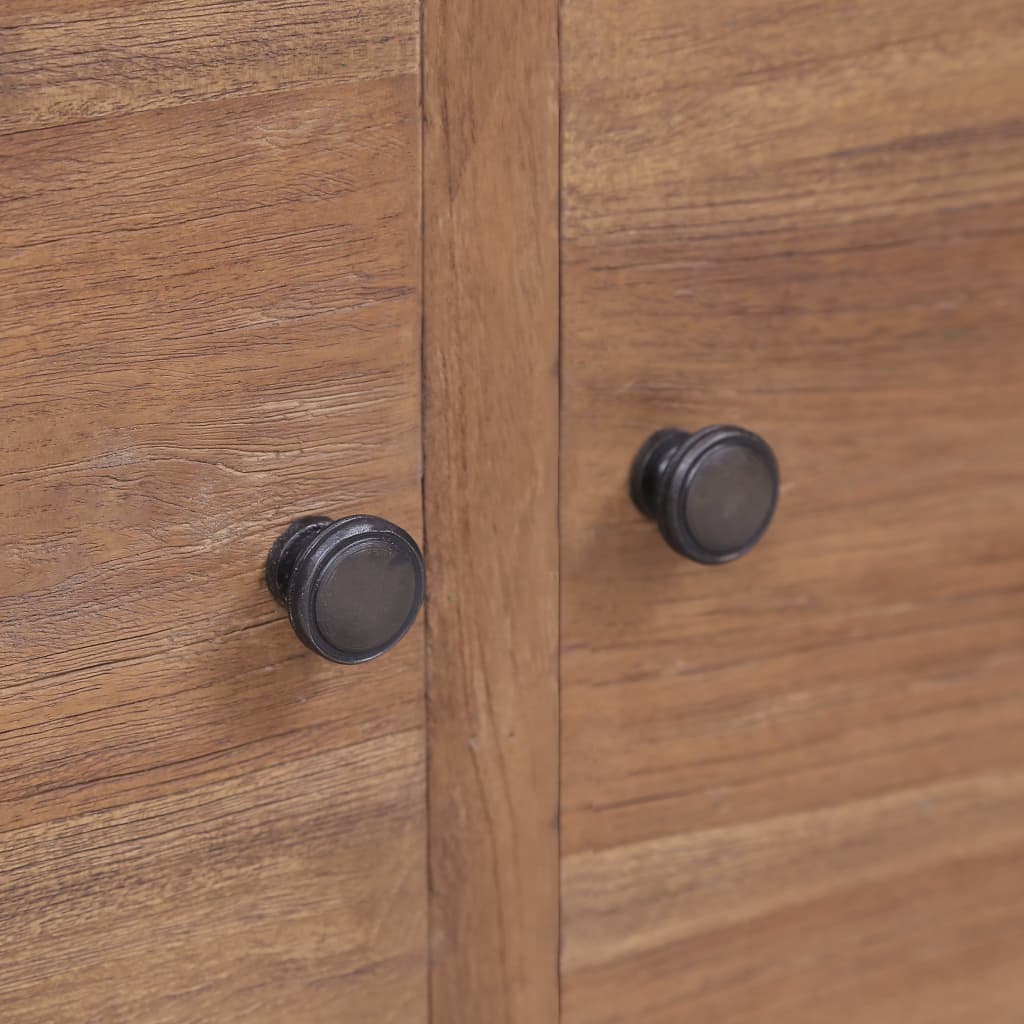 Skåpet är tillverkat i massiv teak med återvunnen finish och naturlig färg, som är känt för sin exceptionella styrka. Varje steg i processen utförs med största omsorg, vare sig det är polering, målning eller lackering. Skåpet har en stadig bordsskiva i lövträ där du kan ställa sånt du kan behöva. Skänken har 2 dörrar och 2 lådor för att hålla dina tidningar, böcker, DVD:er och mediaenheter organiserade och inom räckhåll. Dessutom har lådorna mässingshandtag med antik finish för enkel öppning och stängning.