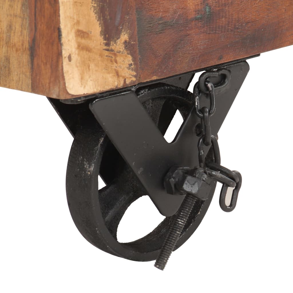 Skänken är tillverkad i återvunnet trä, som innebär att den har karaktärsdrag från olika typer av trä såsom furu, teak, ek, mangoträ, akacia med mera. Återvunnet trä är redan åldrat, väderbitet och torkat så det varken krymper eller böjs. Tecken på slitage och fina träådringar gör varje möbel annorlunda från varandra. Varje steg i processen utförs med största noggrannhet, vare sig det är polering, målning eller lackering. Dessutom kan du enkelt flytta skänken tack vare dess 4 gjutjärnshjul.