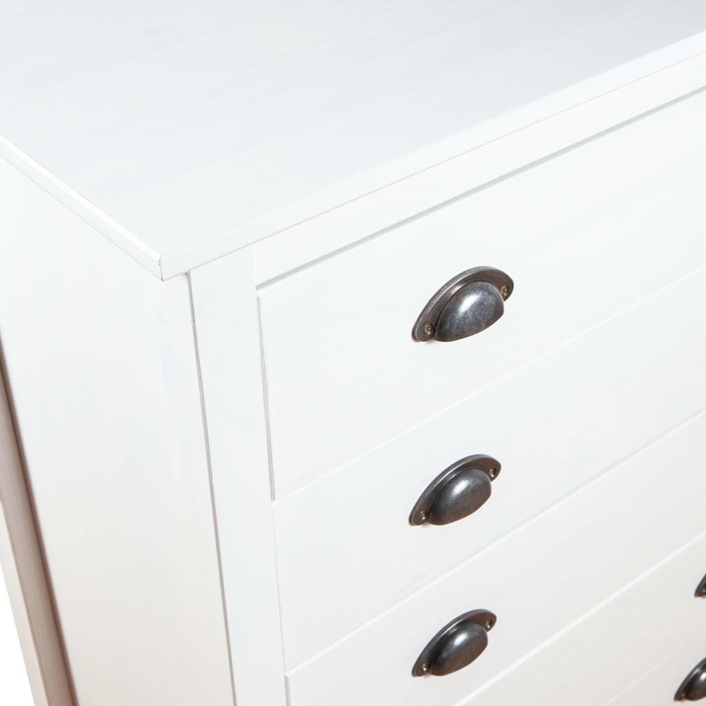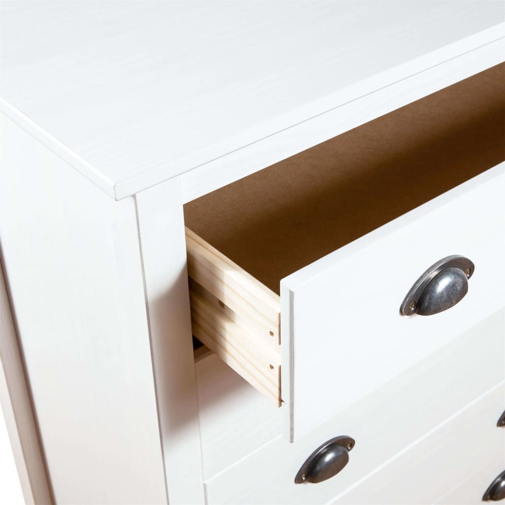 Denna högkvalitativa skänk i massiv furu är robust och hållbar. Den är utrustad med 5 mjukt rullande lådor med handtag, vilka erbjuder mängder med utrymme för förvaring av personliga tillhörigheter och håller därmed ditt hem i bättre organiserad ordning. Du kan också förvara saker som foton, böcker och krukväxter på ovansidan. Den är enkel att rengöra med en fuktig trasa.