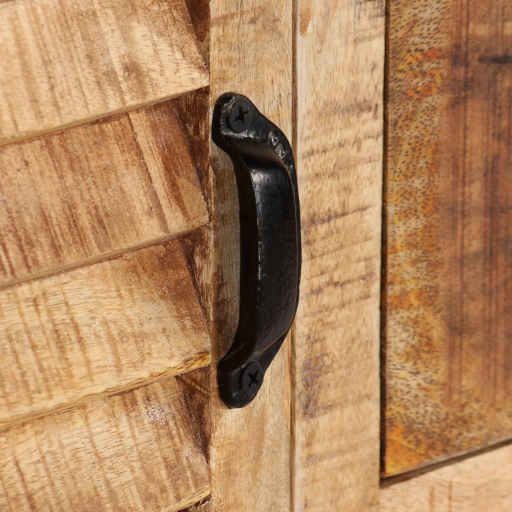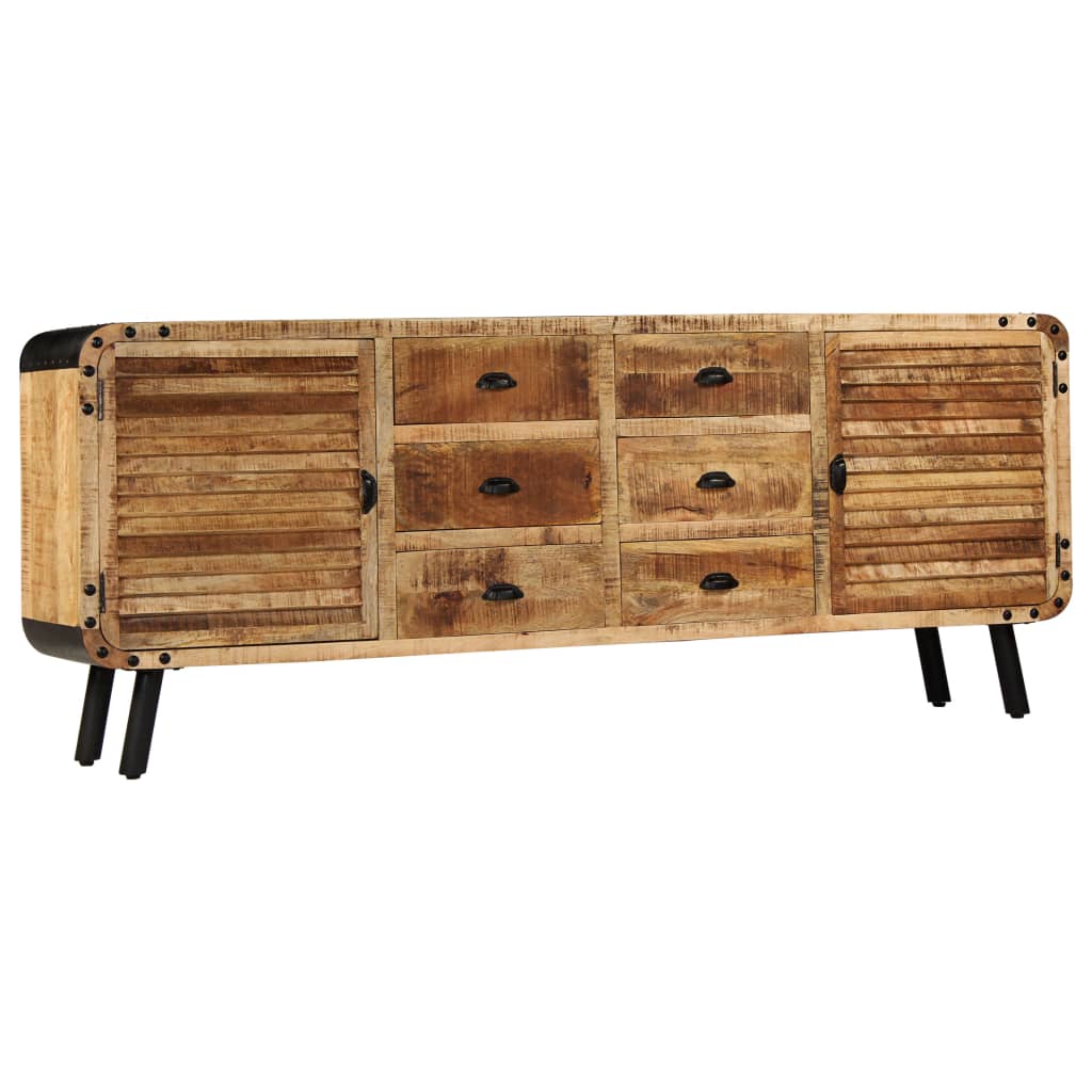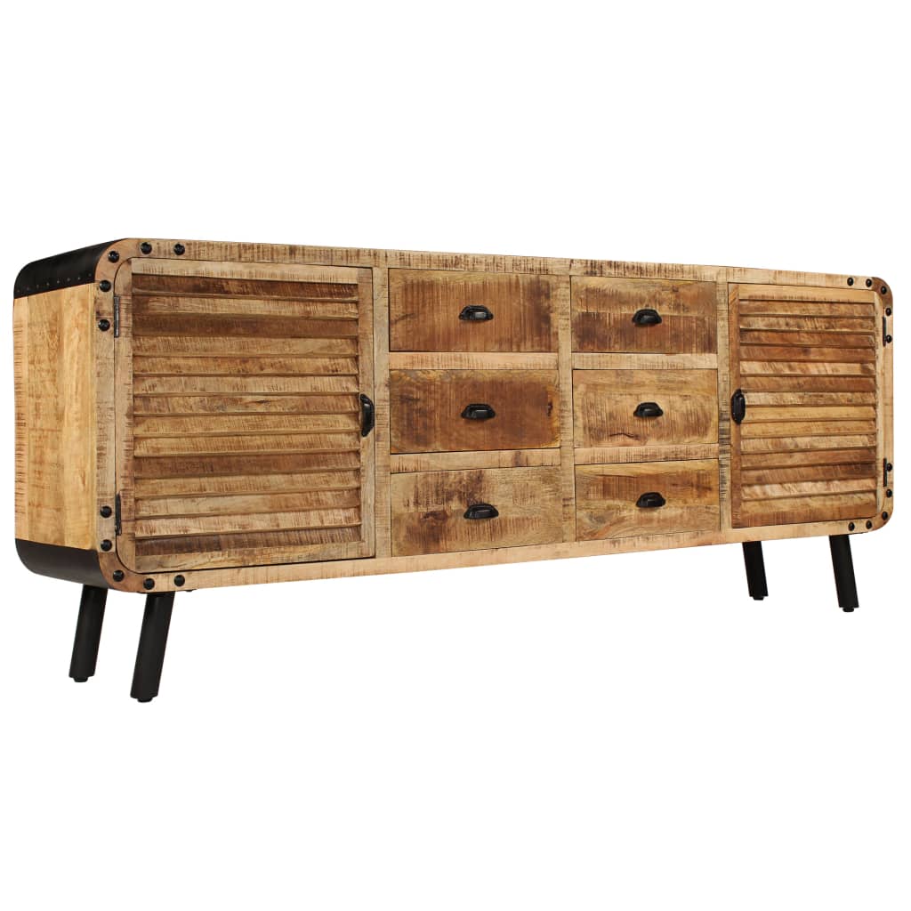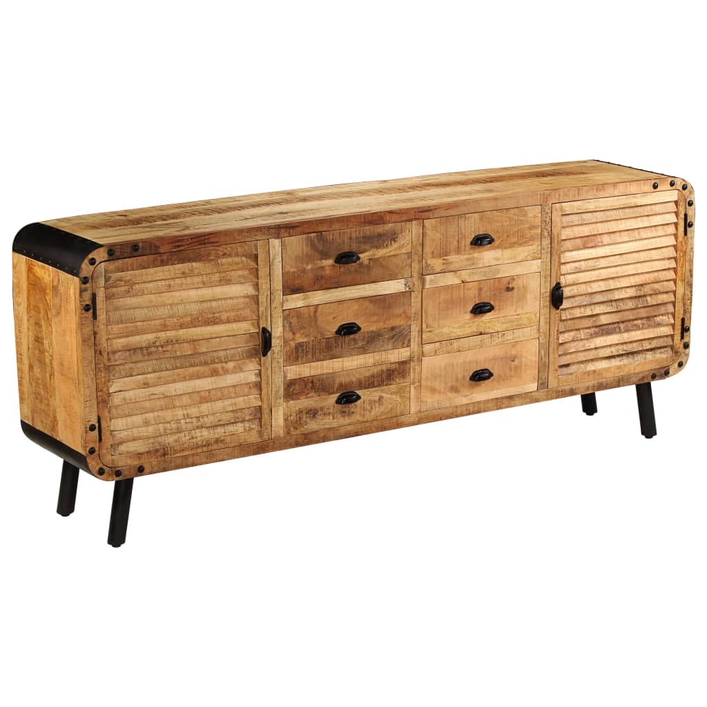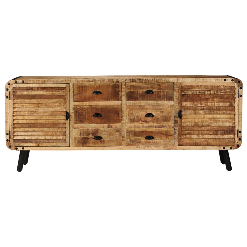 Skänken är tillverkad i massivt mangoträ som har polerats och lackerats men ändå har sin naturliga färg och sitt grova utseende. De vackra träådringarna gör varje möbel unik och något annorlunda från de andra. Kommoden har en robust och stabil ovansida där du kan ställa fruktkorgar, vaser eller andra dekorativa föremål. De 6 lådorna och 2 skåpen ger extra förvaringsutrymme. Metallelementen bidrar till skänkens industriella stil. Monteringen är enkel.