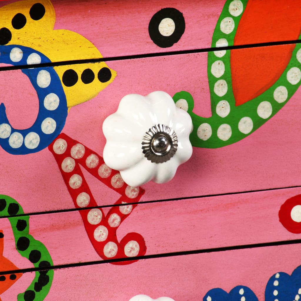 Bordet är handgjort av mangoträ, vilket både är slitstarkt och vackert, och hantverket bidrar till den spektakulära retrostilen. Bordet har handmålade, dekorativa detaljer som utstrålar elegans och belyser det raffinerade utseendet. De distinkta handtagen gör det lättare att öppna lådorna och ger samtidigt bordet en unik stil.