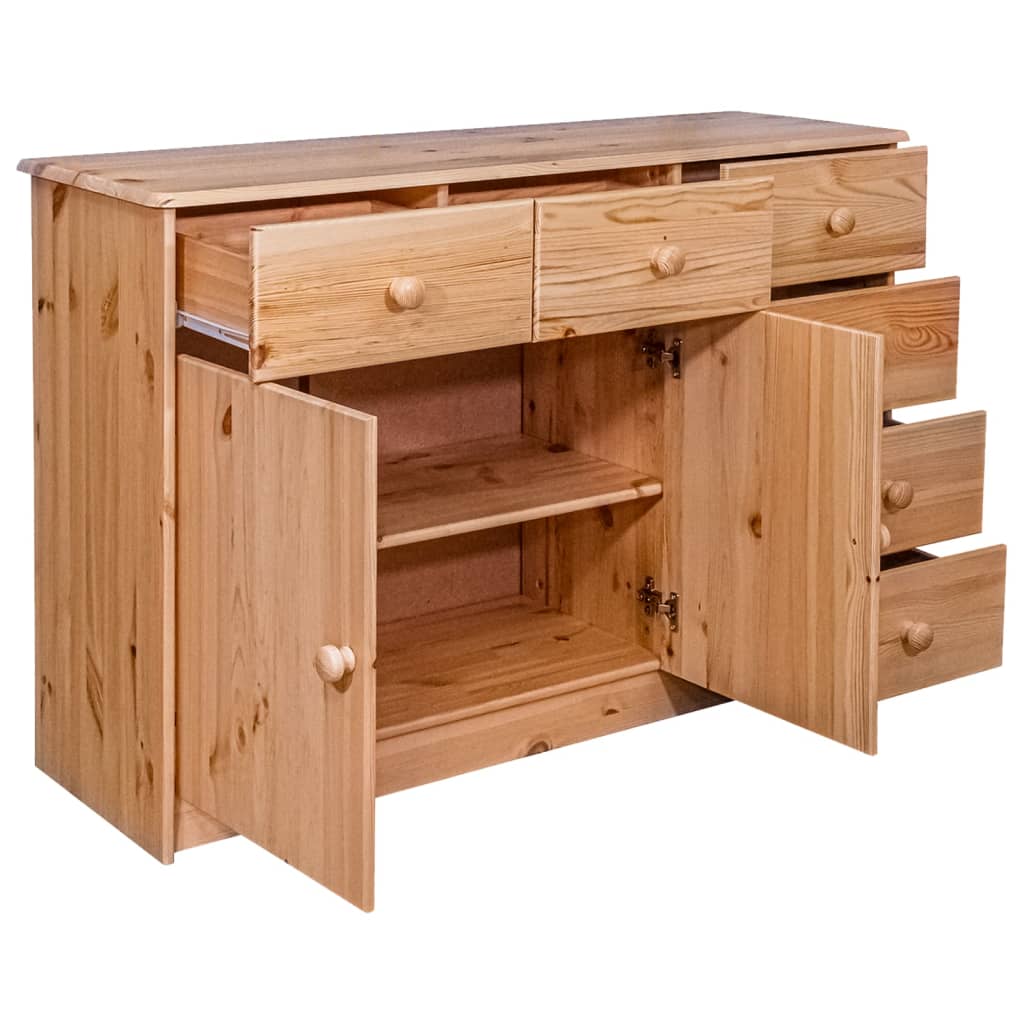 Förvaringsskänken är tillverkad i massiv furu och är robust men rymlig. Den gör det mesta ytan i ditt hem. Skänken har 6 lådor och 2 dörrar med massor av plats, så du kan ställa en vas, bildram, växt och andra småsaker ovanpå och förvara kläder, leksaker mm. i lådorna och hålla rummet städat.