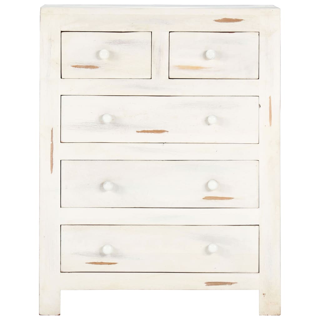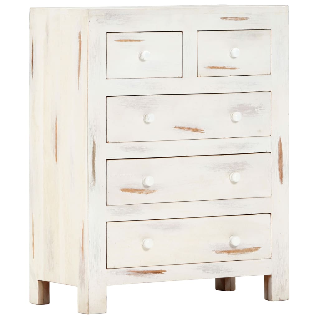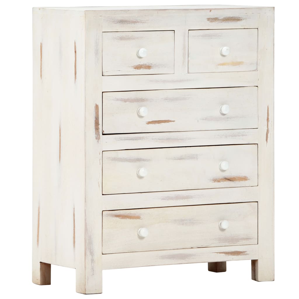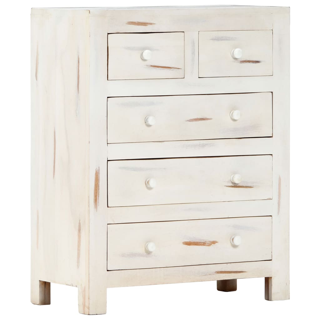 Skänken är utrustad med 5 lådor och har gott om utrymme för förvaring av kläder, leksaker, böcker, tidningar och andra föremål. Den är tillverkad av massivt akaciaträ med en vit beläggning som utstrålar ett modernt utseende. Uppgradera ditt hem till nästa nivå med vår moderna skänk!