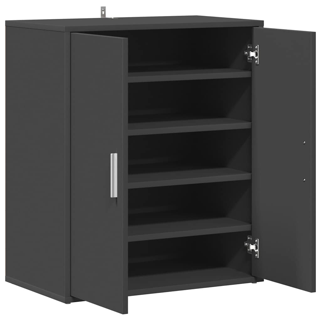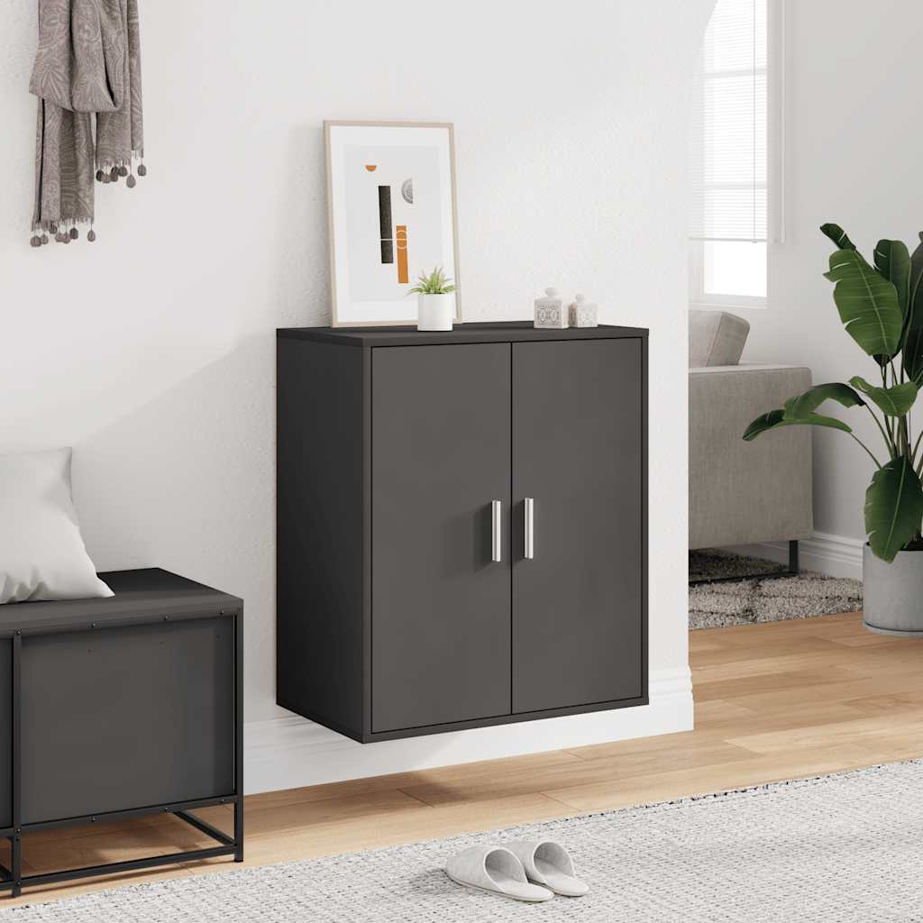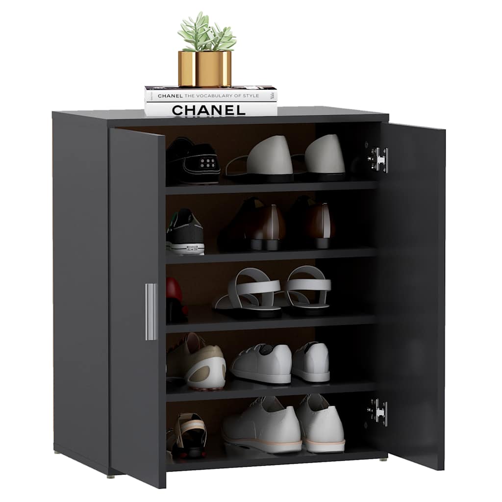 Hallskåpet är tillverkat av spånskiva och är mycket hållbart och robust. Det har 5 hyllplan med gott om plats att organisera skor. Tack vare de 2 dörrarna skyddar skomöbeln skorna från damm och håller dem utom synhåll. Dessutom kan den monteras på golvet eller väggen efter behov.