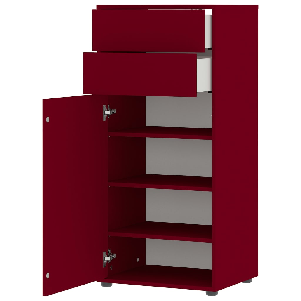 Den är tillverkad i laminerad spånskiva med en vacker rubinröd färg. Skoskåpet består av två lådor och tre justerbara hyllor (var och en med en lastkapacitet på upp till 10 kg) med gott om förvaringsutrymme för olika vardagliga saker och upp till 8 par skor.