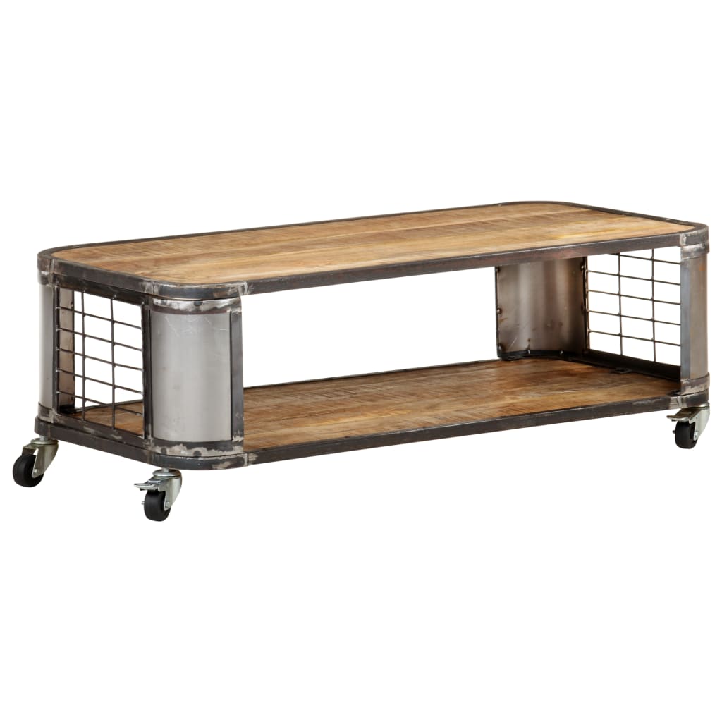 Detta snygga soffbord är tillverkat i massivt mangoträ, ett lövträ med täta ådringar. Det är tillverkat med stål och är tillräckligt starkt för att stödja vikten och stå emot tidens tand. Bordet har 4 hjul som gör det enkelt att flytta runt.
