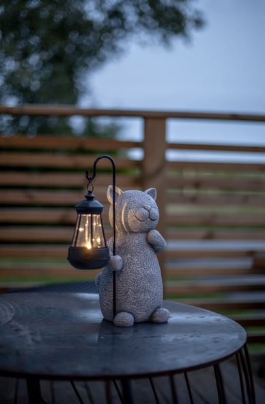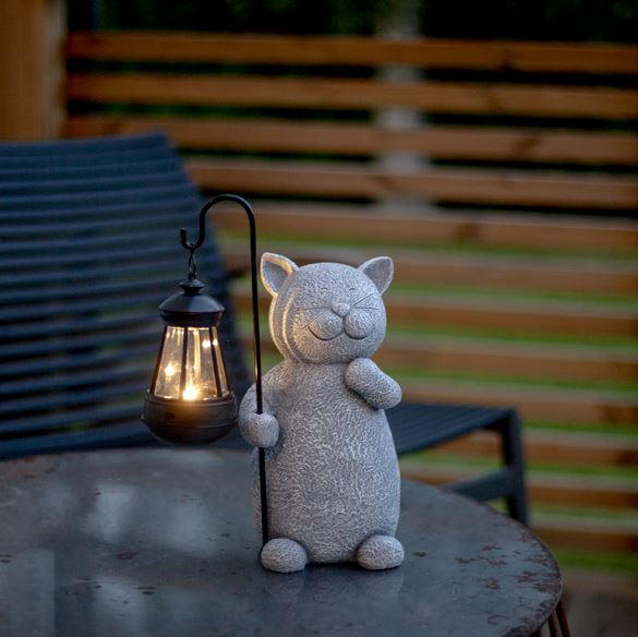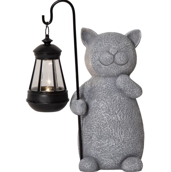 Solcellsdekoration tillverkad av polyresin som imiterar granit. En katt håller en lykta som lyser med ett varmvitt ljus. Det medföljande batteriet laddas av solen under dagen och gör att ljuset tänds när det blir mörkt.