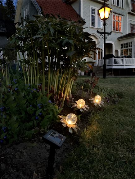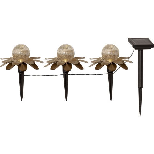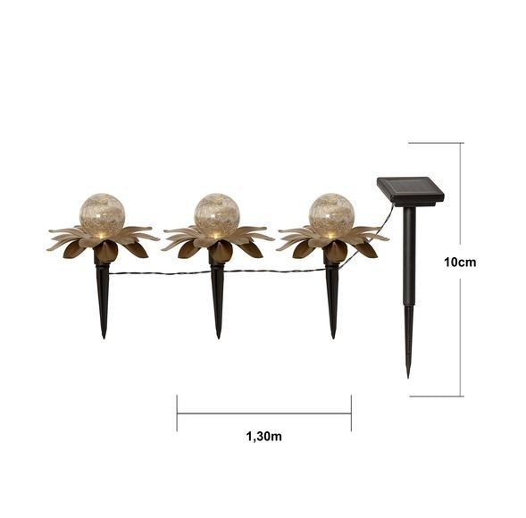 Vår vackra solcellsdrivna dekoration Lilly har 3 dekorationer som består av guldfärgade metall löv med en glaskula inuti. De är ca 15 cm i diameter och 10 cm höga. De lyser med ett varmvitt sken genom glaskulan. De 3 dekorationerna sitter ihop med 65 cm svart kabel och den totala längden blir ca 130cm. Denna solcellsdekoration är fin att dekorera med i trädgården eller på en balkong. Själva paneldelen sitter med 2 meters kabel från den sista dekorationen, detta gör det enkelt att placera panelen i direkt solljus vilket är nödvändigt för att ladda batteriet som medföljer.