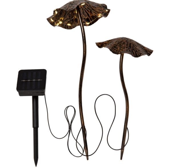 Solcellsdekoration i form av 2 svampar gjorda i bronsmålad metall. Under varje svamphatt sitter små micro led som lyser med ett varmvitt sken när mörkret faller, 10 led under den ena och 12 led under den andra. Batteriet som medföljer laddas av solen under dagen och gör att dekorationen lyser när det mörknar. Solcellspanelen sitter med 100cm kabel från den sista svampen vilket gör det enkelt att placera panelen i solen och dekorationen på önskat ställe.