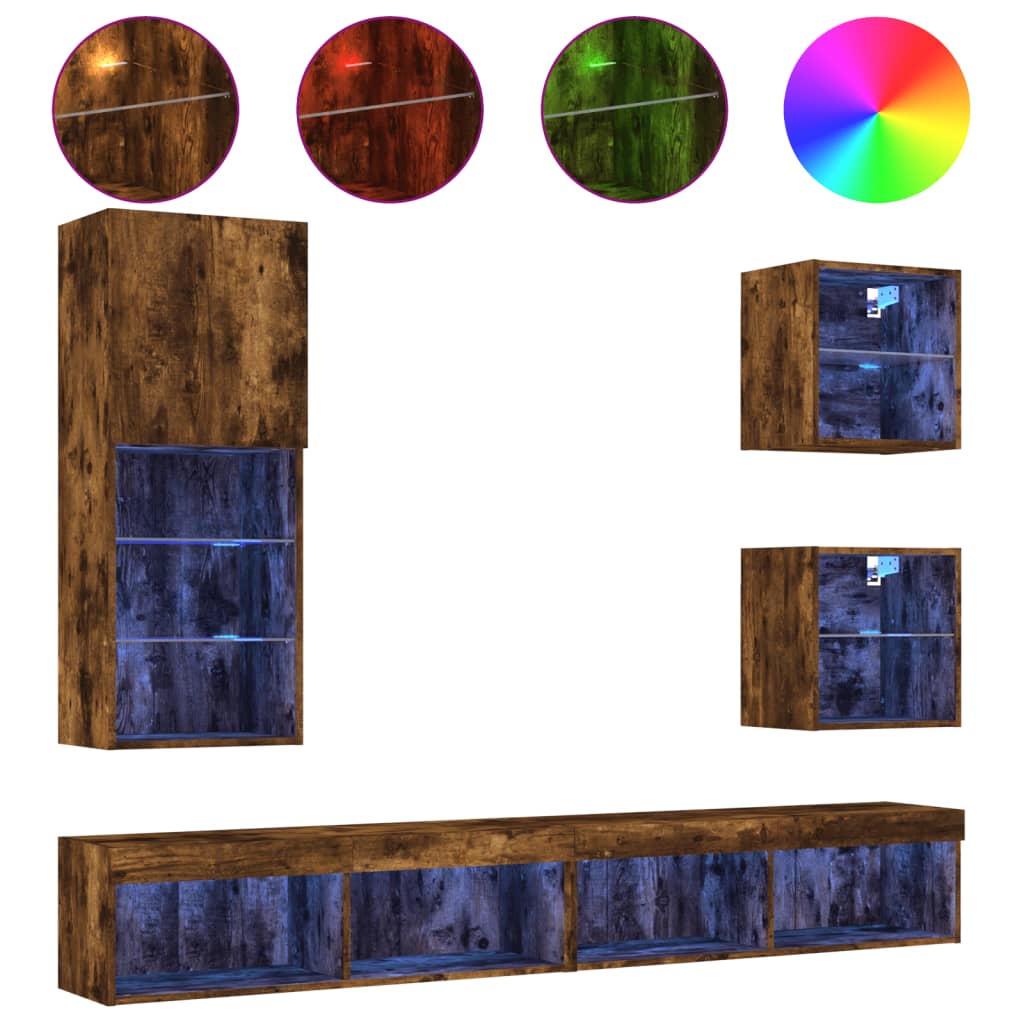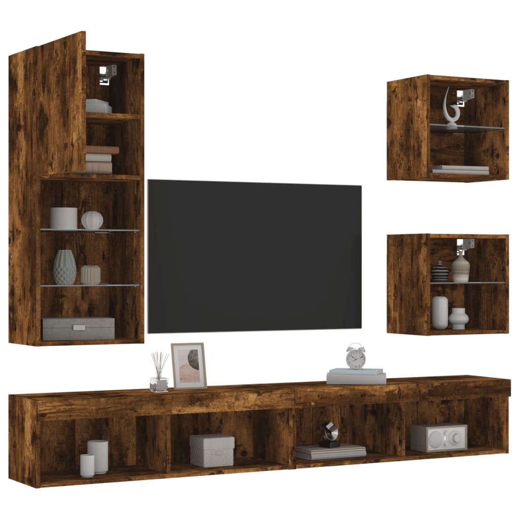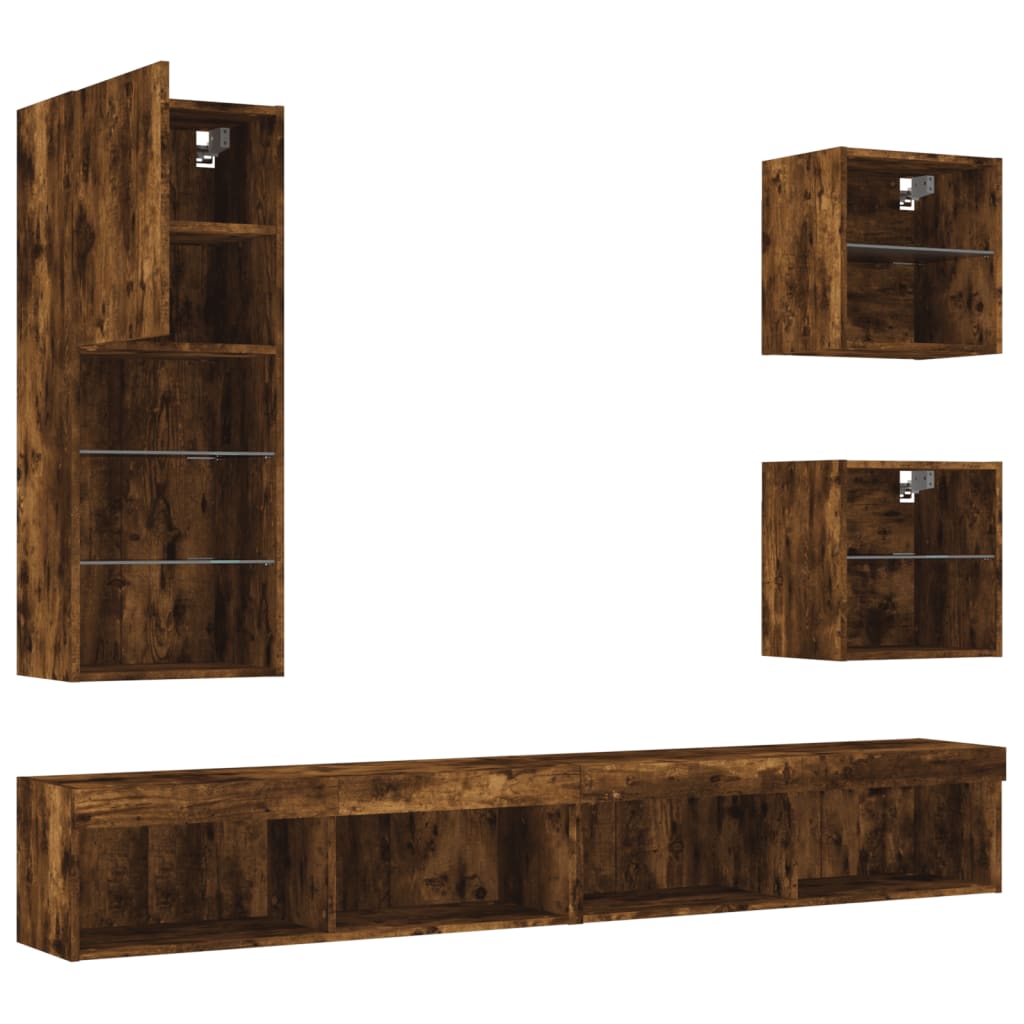 Tv-bänk 5 delar LED rökfärgad ek konstruerat trä