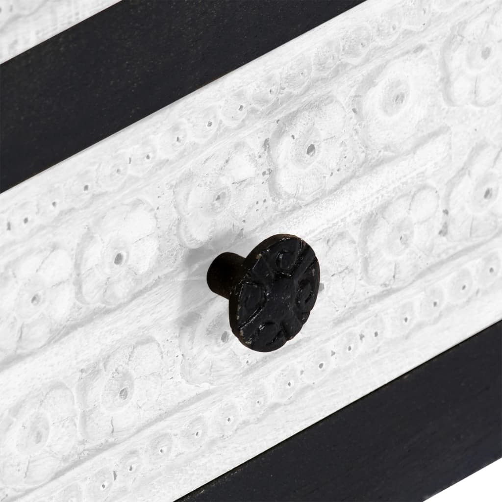 Denna tv-bänk är tillverkad av massivt mangoträ som har fått en vacker ytbehandling genom polering, målning och lackering för ett elegant utseende. Dessutom bidrar det handsnidade mönstret på dörren och lådorna till skänkens skönhet. Tv-bänken är enkel att montera och enkel att rengöra med en fuktig trasa.