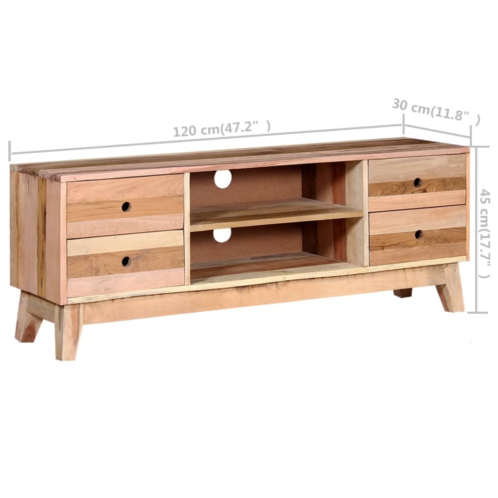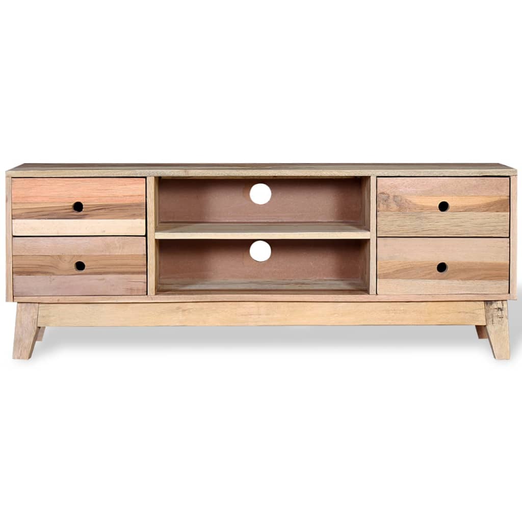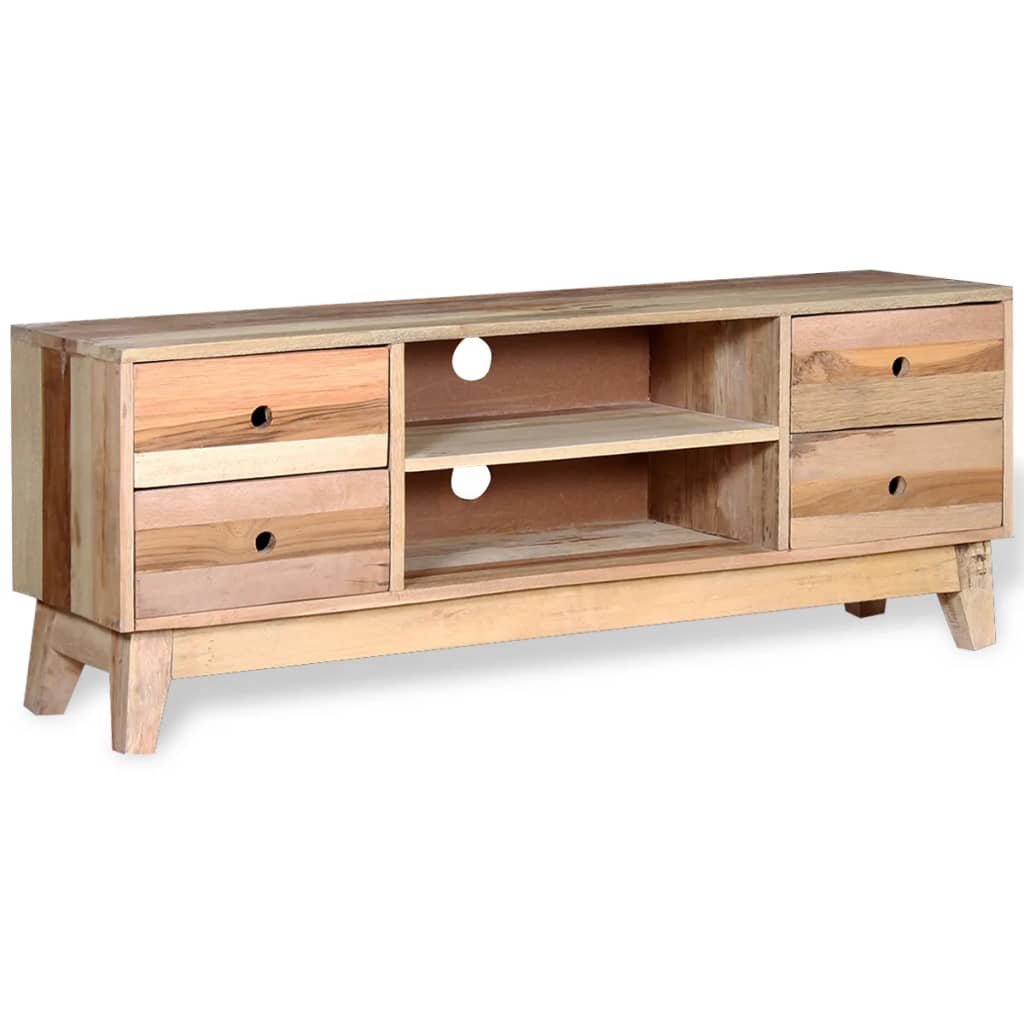 Den här eleganta TV-bänken i återvunnet trä i antik stil är mycket praktisk och har ett stort förvaringsutrymme tack vare de rymliga lådorna och hyllan. Med dess unika utseende blir den ett fantastiskt tillskott i vardagsrummet eller sovrummet. Bänken kan även användas som sidobord, avlastningsbord med mera.