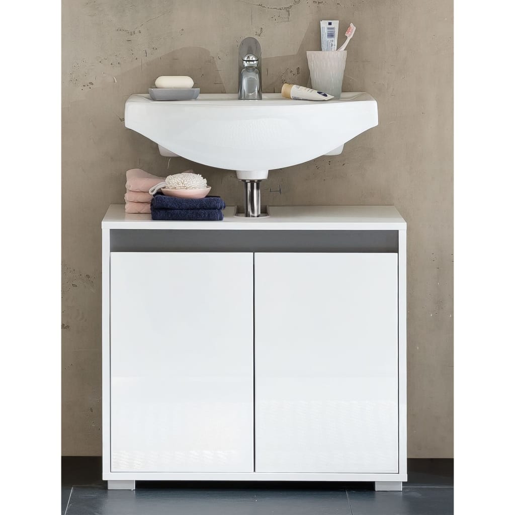 - Praktiskt under handfatet: Detta badrumsskåp har två dörrar med eleganta infällda grepp.