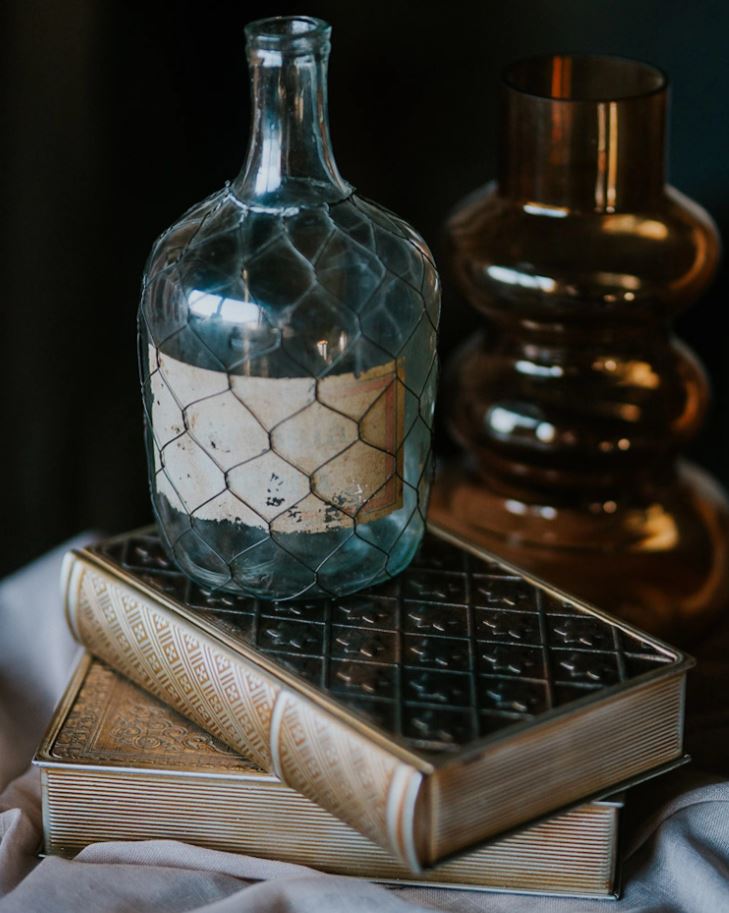 Inred hemmet med en dekorativ glasflaska med metallnät. Fin att sätta små snittblommor i.